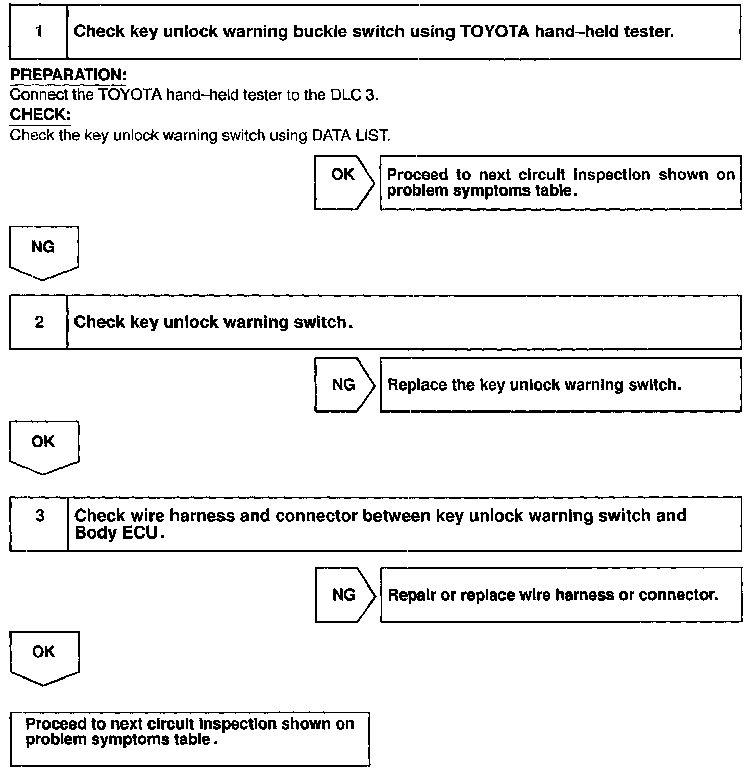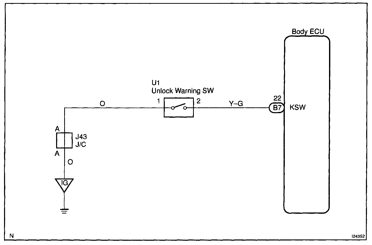 CIRCUIT DESCRIPTIONThe key unlock warning switch is turned on when the ignition key is inserted in the key cylinder and goes off when the ignition key is removed.