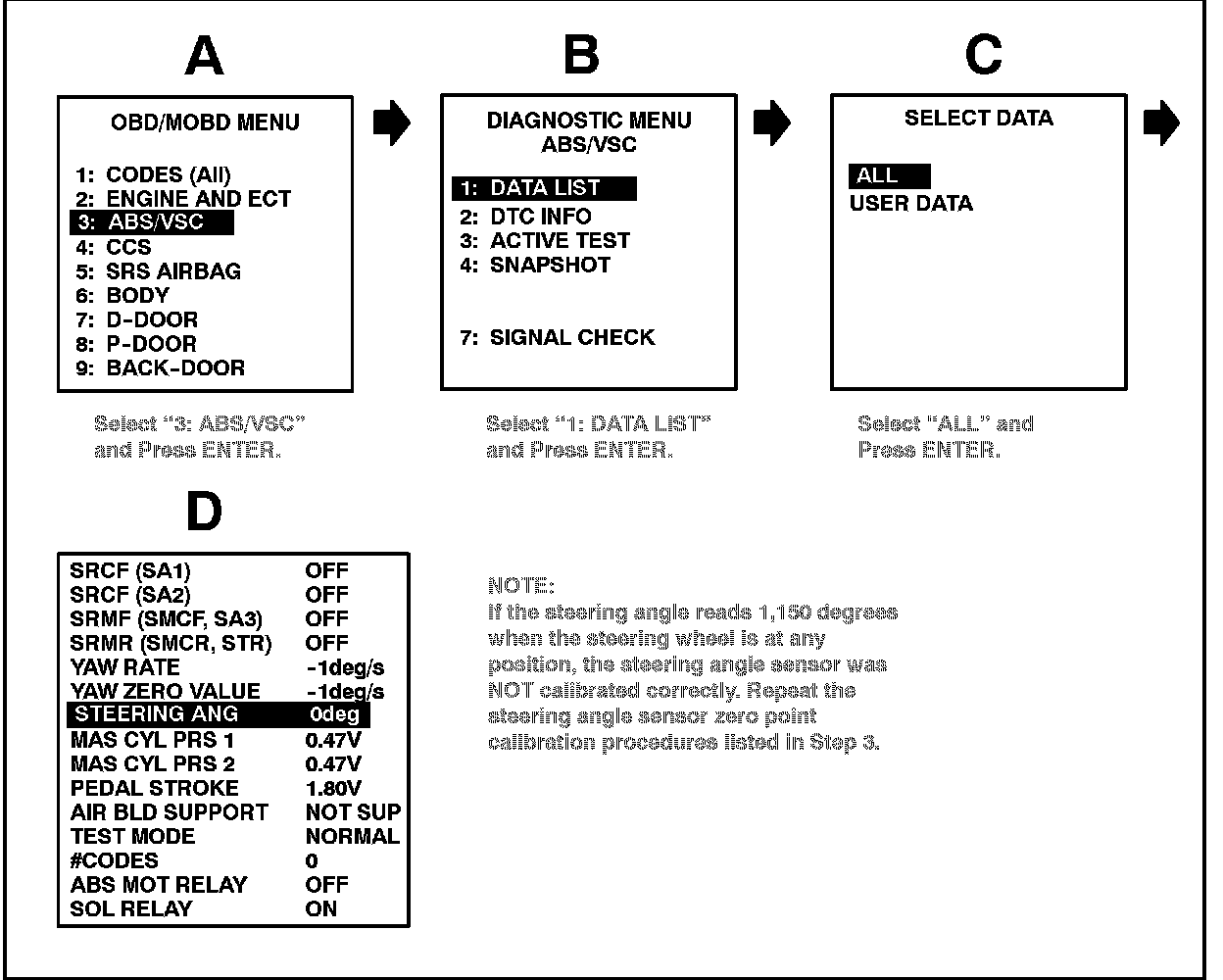 D. View the ABS/VSC Data List to see that the steering angle value changes when turning the steering wheel.