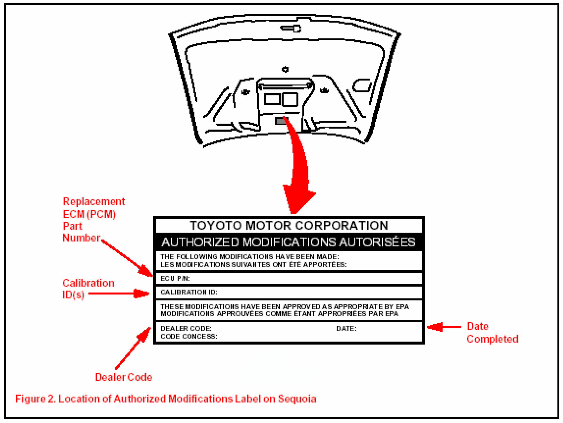 1. Check for the Authorized Modification Label affixed to the vehicle in the location shown in Figure 2. If there is no label present, proceed to step 2.