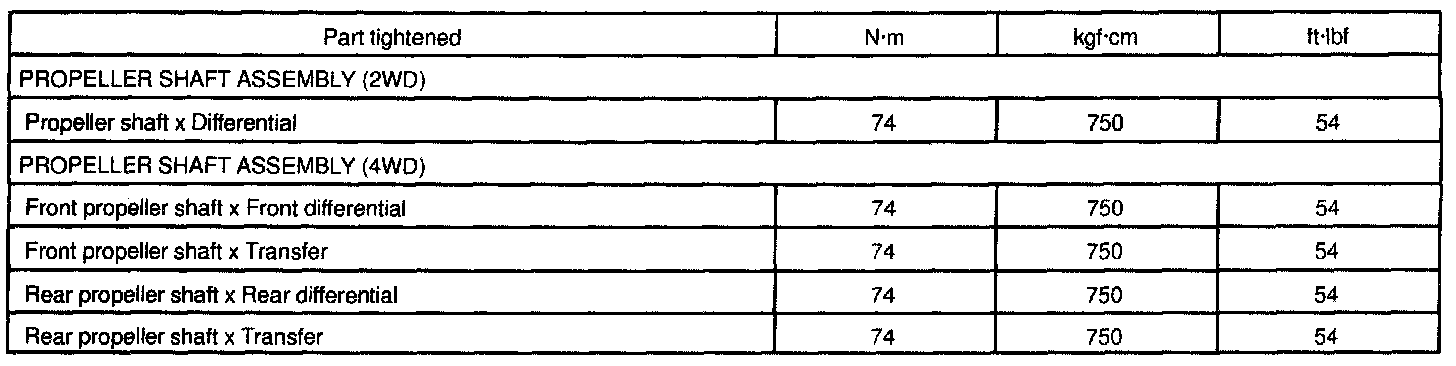 Front propeller shaft x Front differential(4wd) 74 Nm (750 kgf-cm, 54 ft. lbs.)