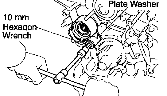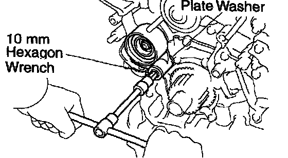 Using a 10 mm hexagon wrench, remove the bolt, idler pulley and plate washer.