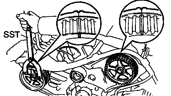 b. Camshaft Timing Pulley Positions: Using SST, turn the camshaft pulley, align the timing marks of the timing pulley and NO. 3 timing belt cover.