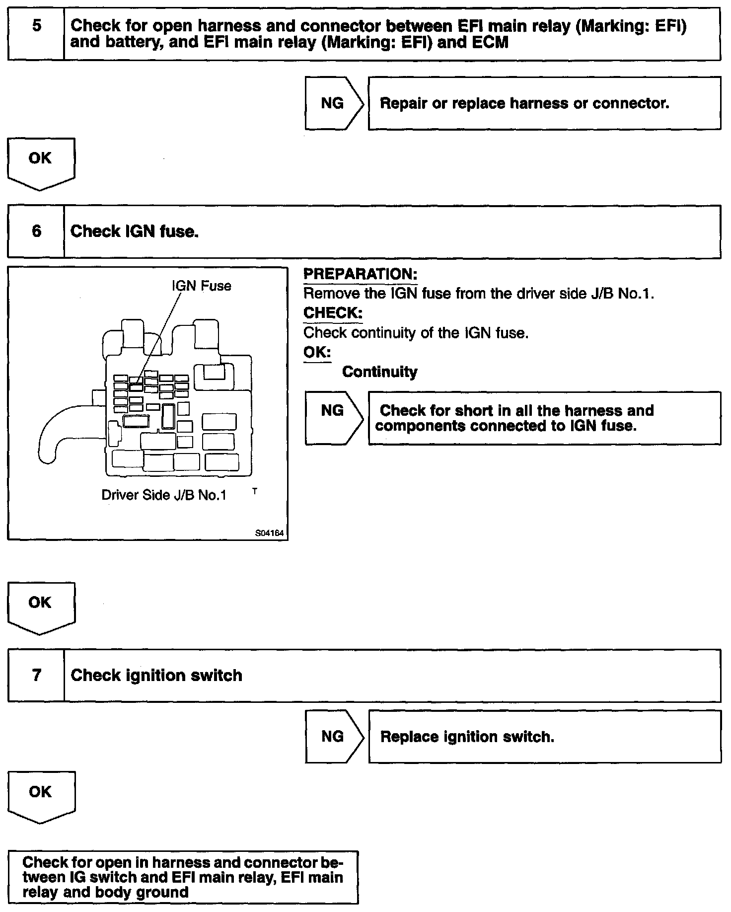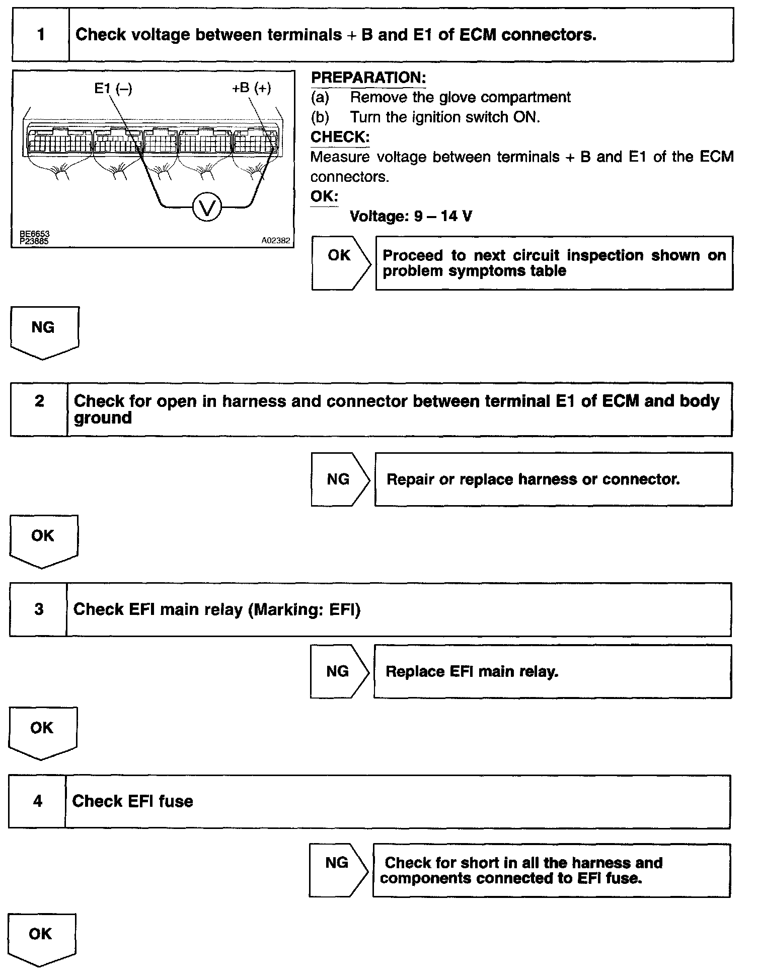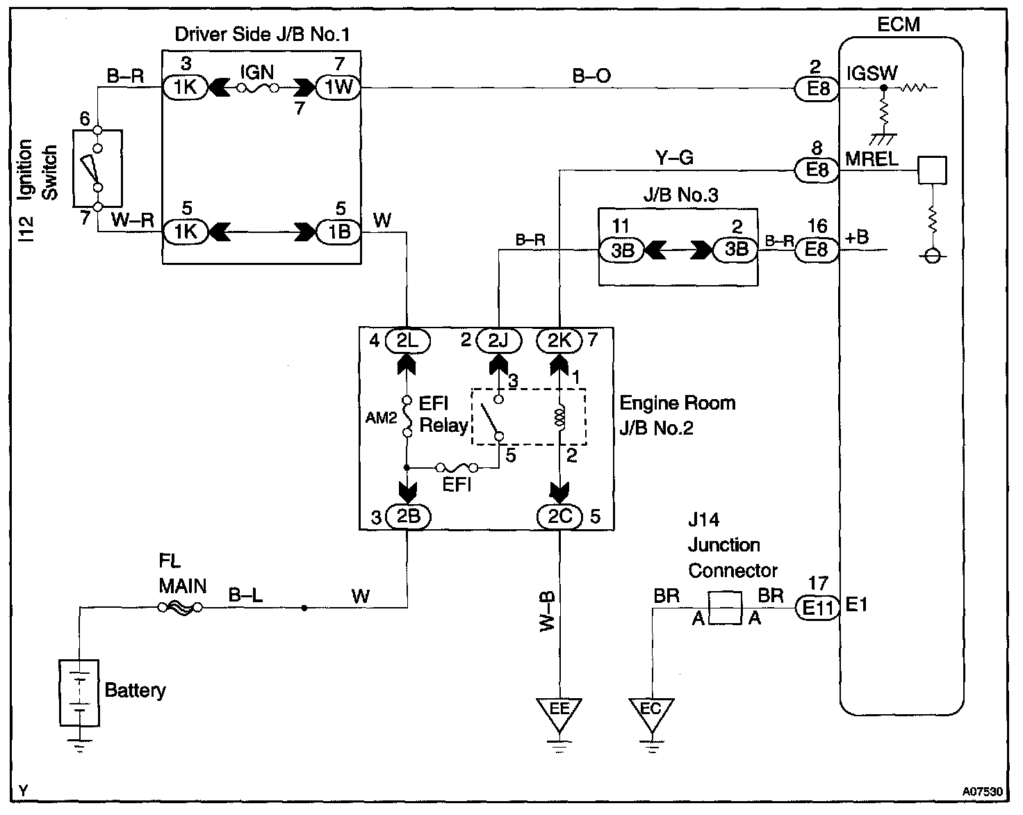 CIRCUIT DESCRIPTIONWhen the ignition switch is turned ON, battery positive voltage is applied to the coil, closing the contacts of the EFI main relay (Marking: EFI) and supplying power to terminal +B of the ECM.