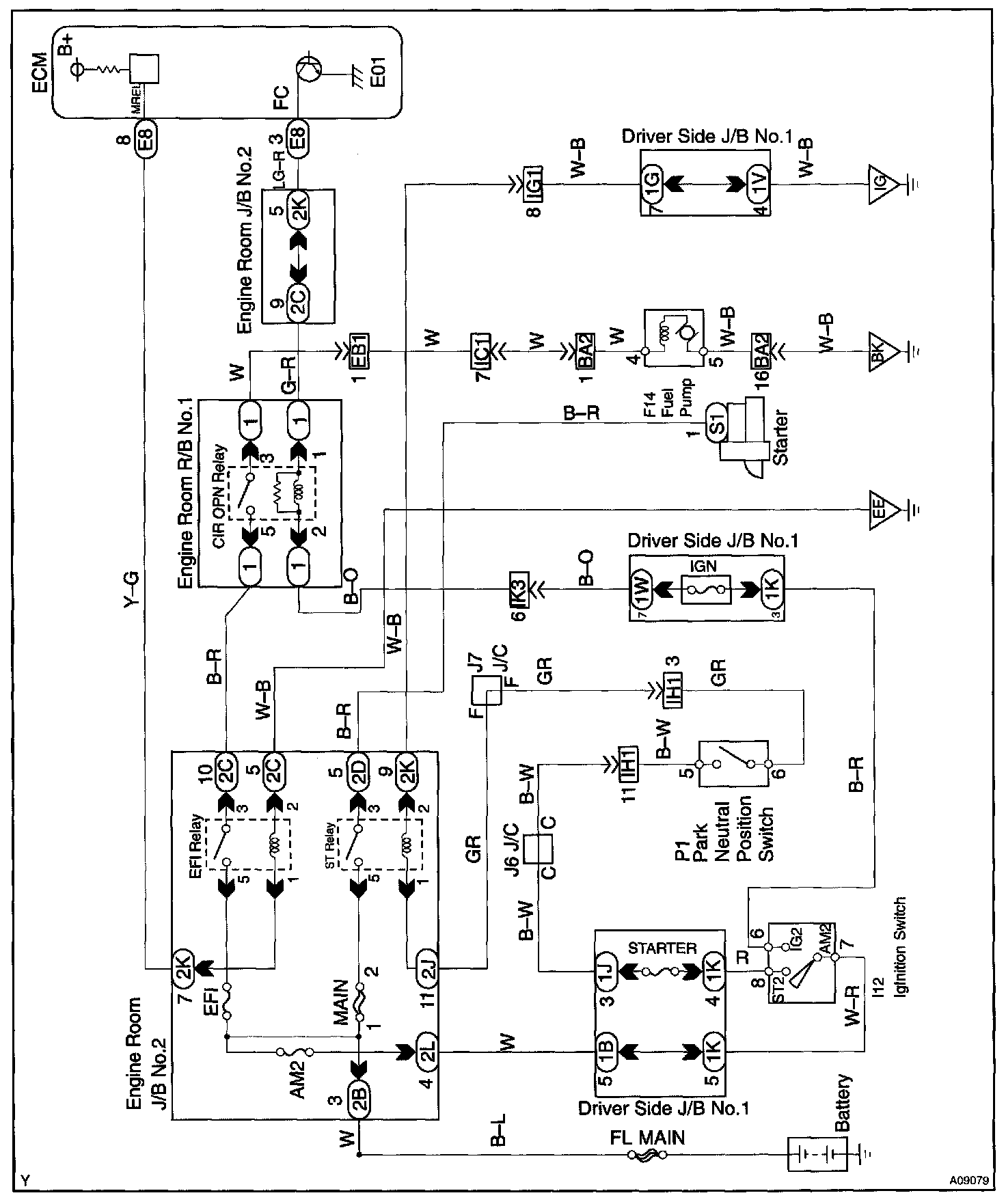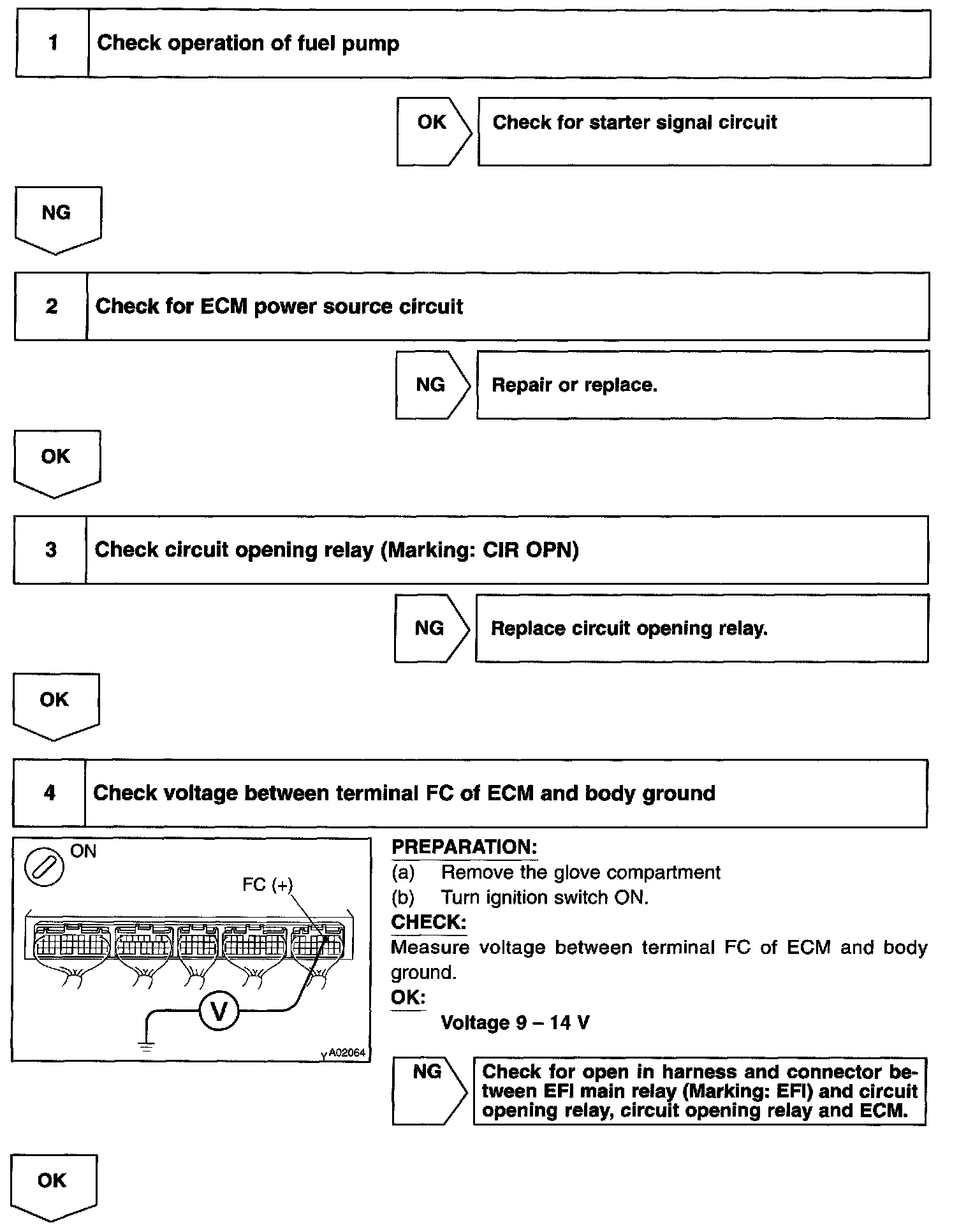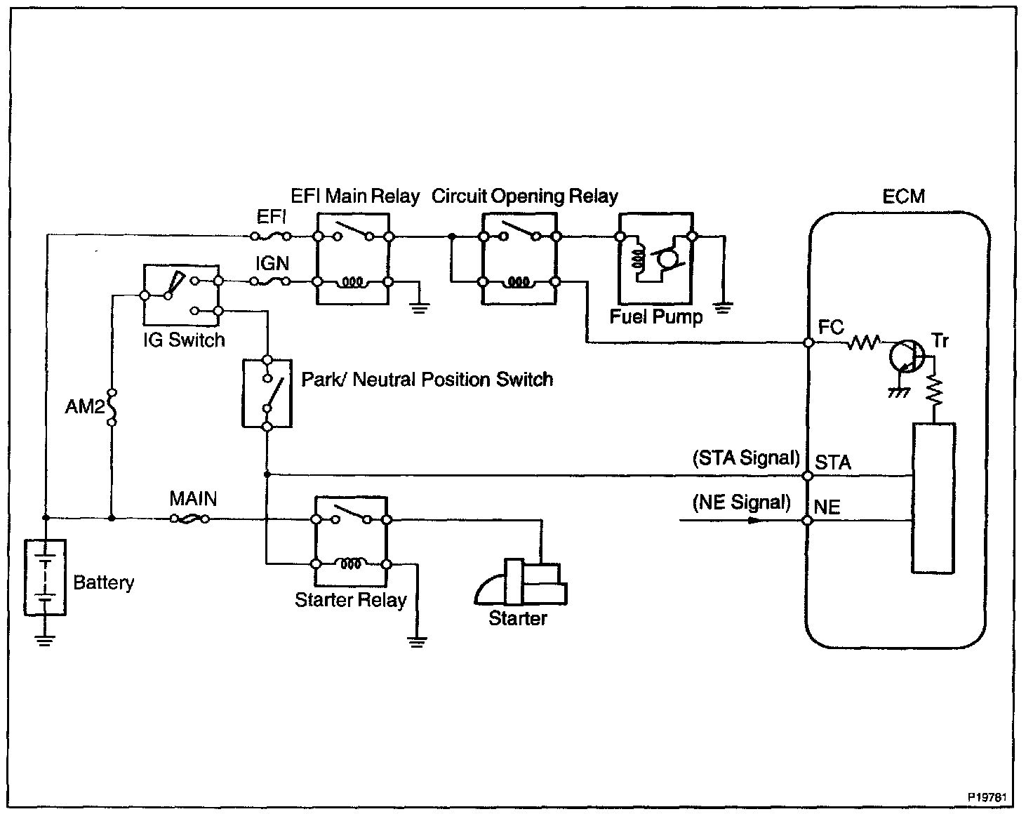 CIRCUIT DESCRIPTIONIn the diagram shown, when the engine is cranked, current the flows from terminal ST of the ignition switch to the starter relay coil and also the current flows to terminal STA of ECM (STA signal). When the STA signal and NE signal are input to the ECM, Tr is turned ON, the current flows to the coil of the circuit opening relay, the relay switches on, power is supplied to the fuel pump and the fuel pump operates.