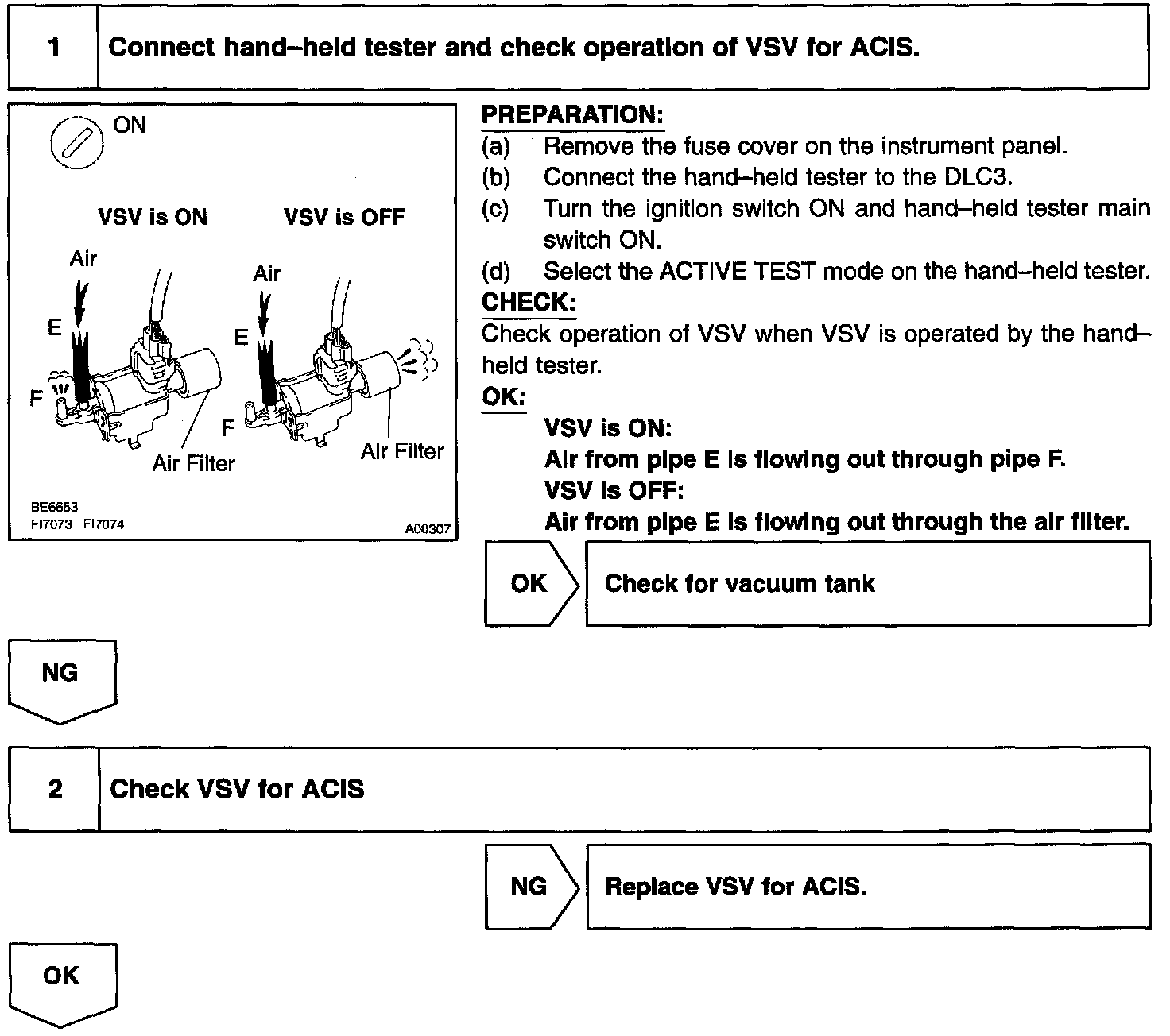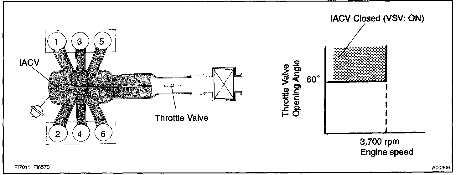 When the engine speed is 3,700 rpm or less and the throttle valve opening angle is 60° or more, the ECM turns the VSV ON and closes the IACV. At all the other time, the VSV is OFF and the IACV is open.