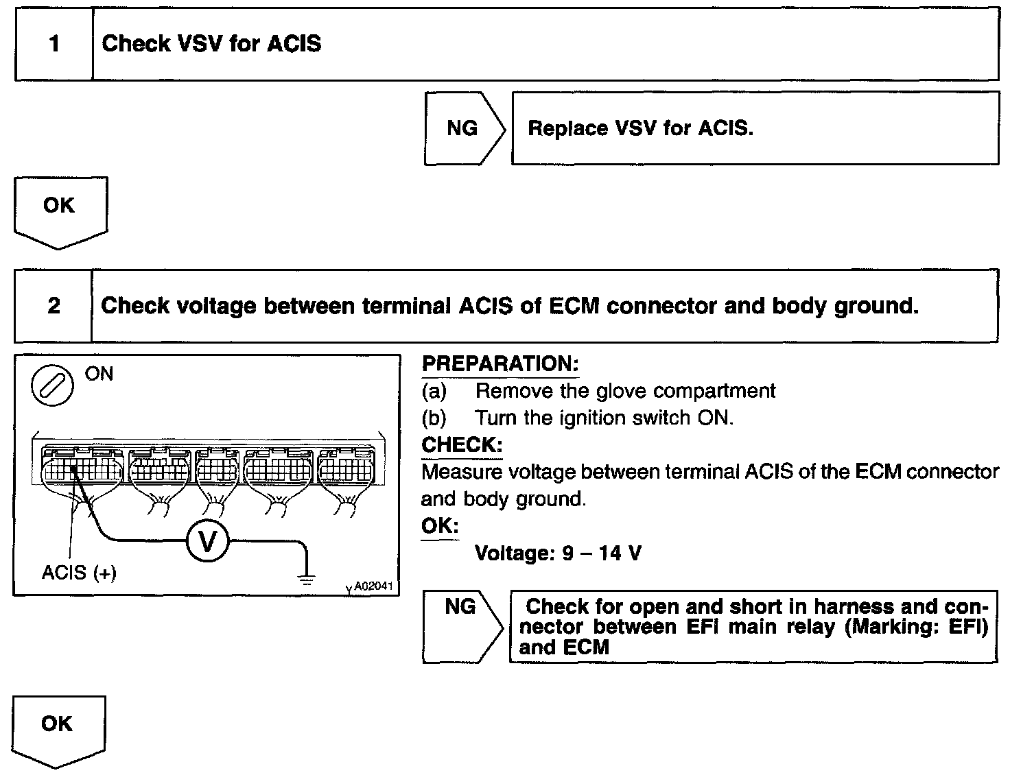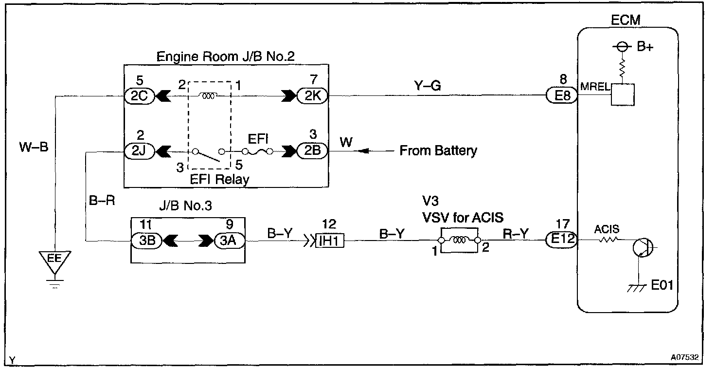CIRCUIT DESCRIPTIONThis circuit opens and closes the Intake Air Control Valve (IACV) in response to the engine load in order to increase the intake efficiency (ACIS: Acoustic Control Induction System).