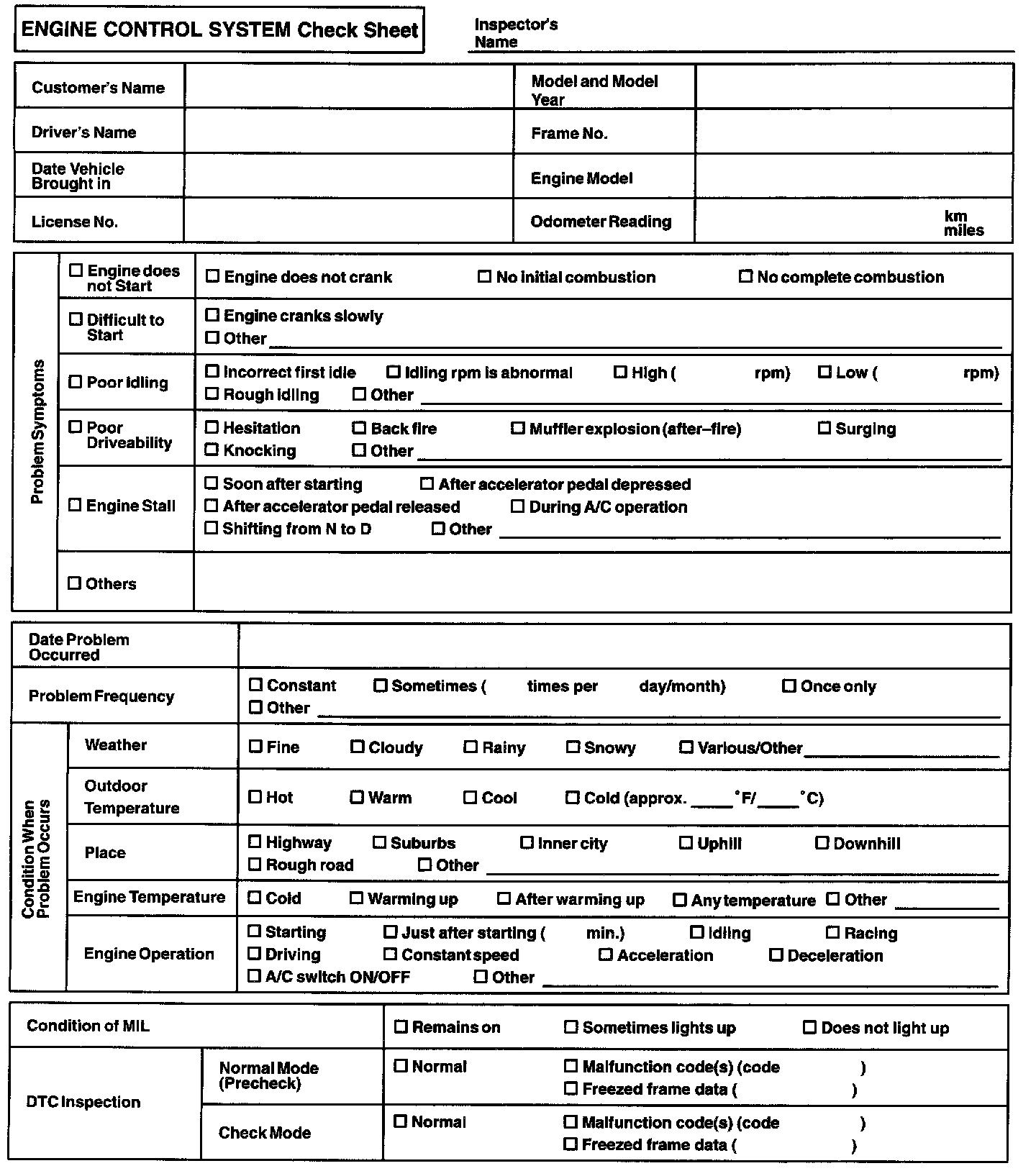 Engine Control System Check Sheet: