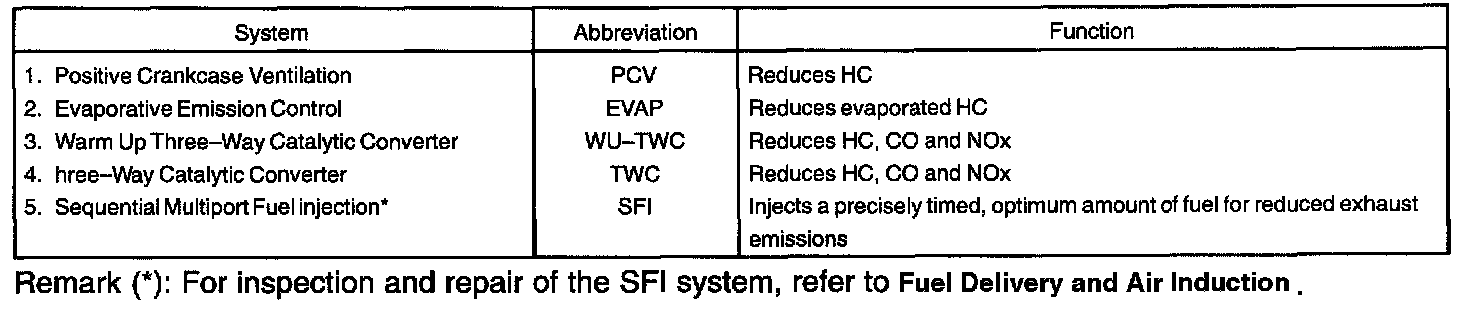 PURPOSEThe emission control systems are installed to reduce the amount of CO, HC and NOx exhausted from the engine (3 and 4), to prevent the atmospheric release of blow-by gas-containing HC (1) and evaporated fuel containing HC being released from the fuel tank (2).