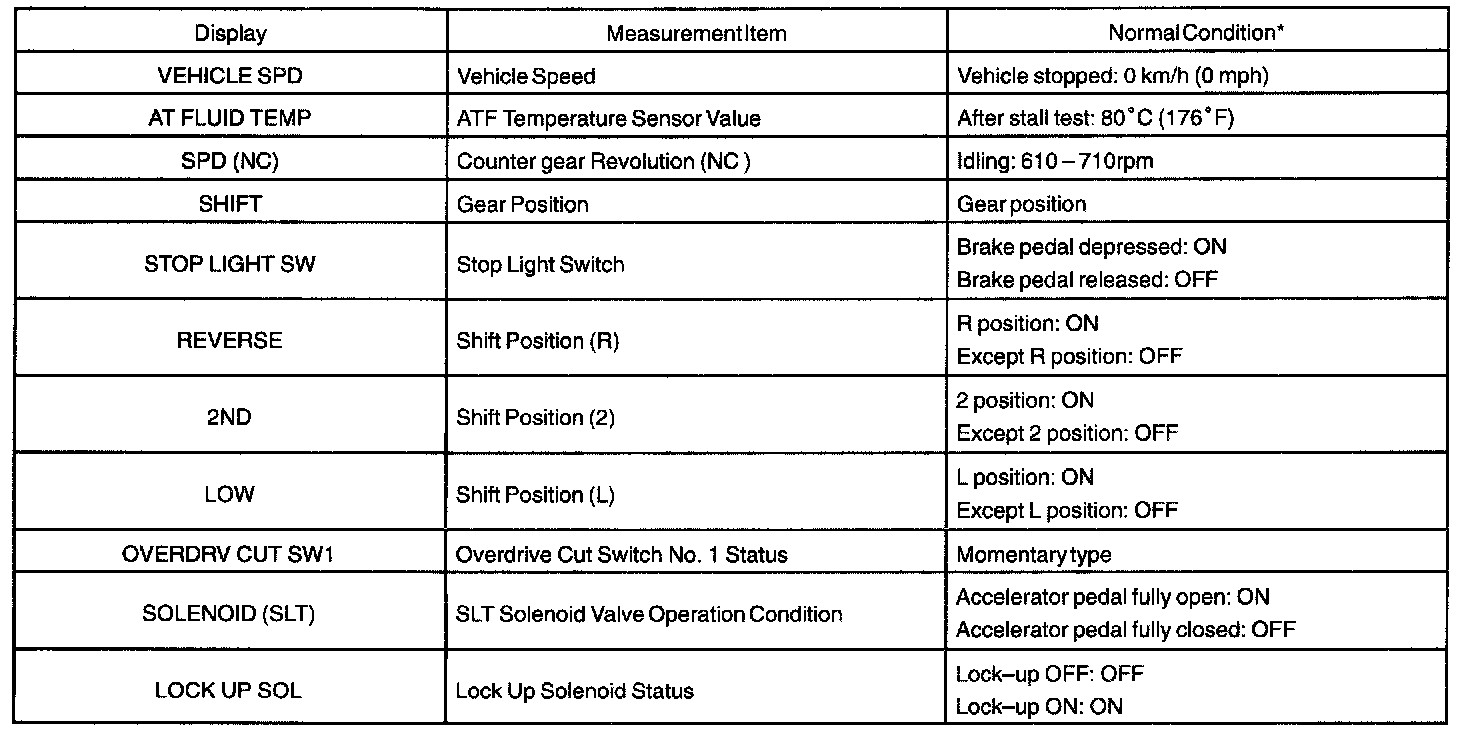 AUTOMATIC TRANSAXLE OPERATING CONDITIONNOTE: The values given for "Normal Condition" are representative values, so a vehicle may still be normal even if its value varies differ from those listed here. So do not decide whether a part is faulty or not solely according to the "Normal Condition" here.