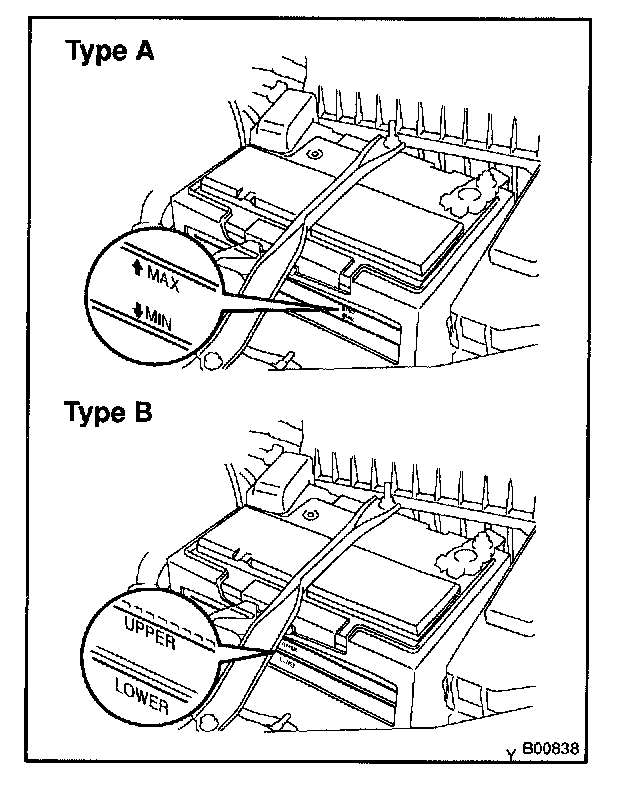 If under the MAX (LOWER) level, replace the battery (or add distilled water if possible). Check the charging system.