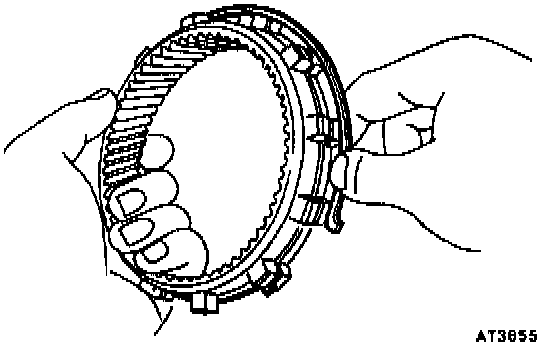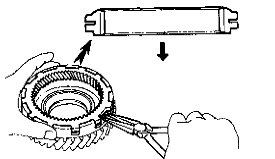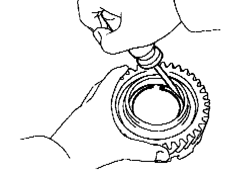 b. While pushing down the ring gear, squeeze the snap ring end with needle-nose pliers, and install it into the groove.