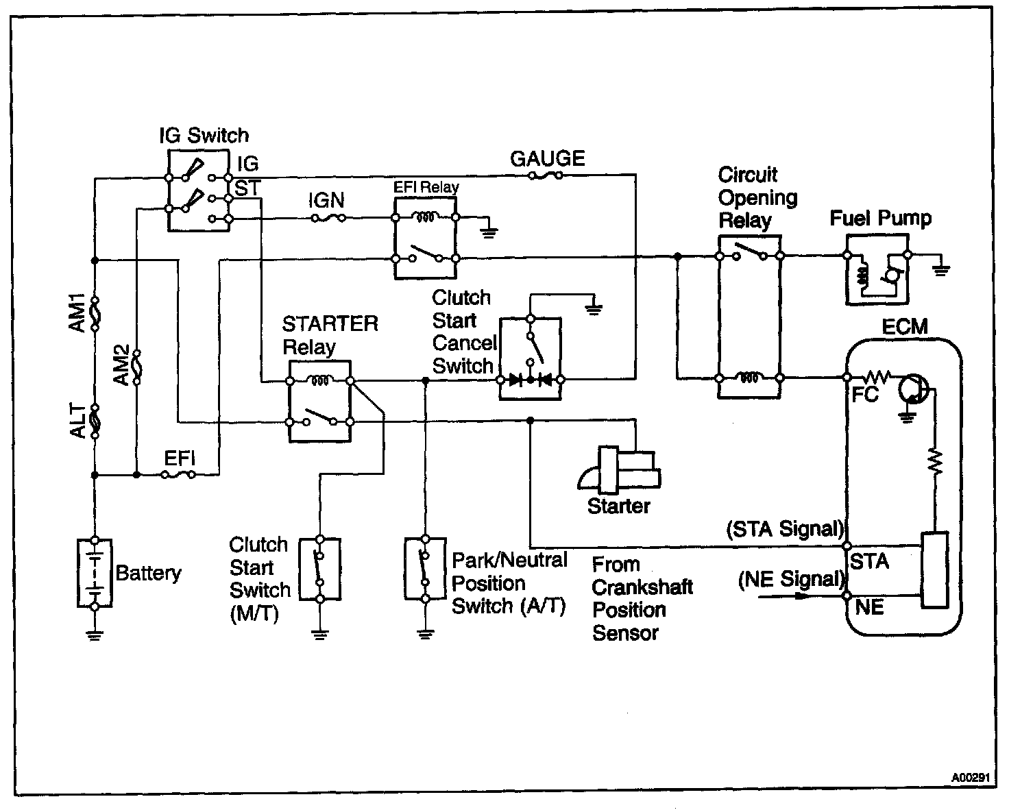 CIRCUIT DESCRIPTIONIn the diagram, when the engine is cranked, current flows from terminal ST of the ignition switch to the starter relay coil and also current flows to terminal STA of the ECM (STA signal).