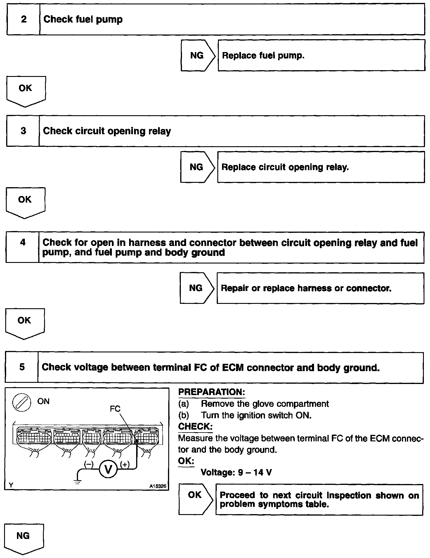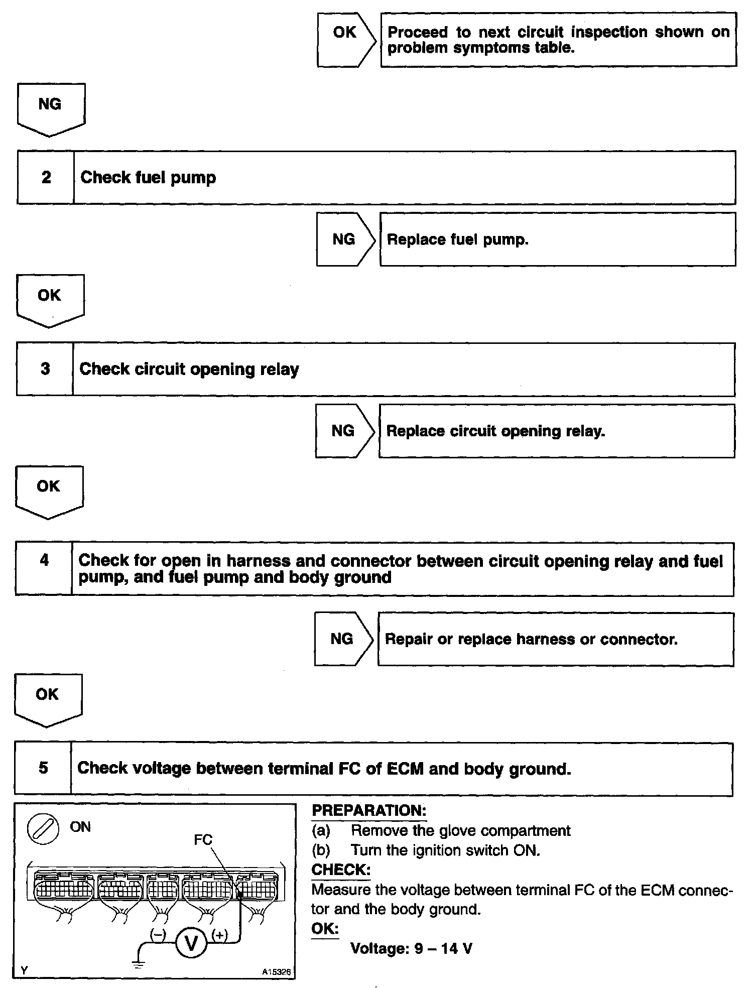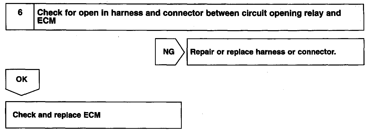 When the STA signal and NE signal are input to the ECM, Tr is turned on, current flows to the coil of the circuit opening relay, the relay switches on, power is supplied to the fuel pump and the fuel pump operates. While the NE signal is generated (engine running), the ECM keeps Tr on (circuit opening relay on) and the fuel pump also keeps operating.