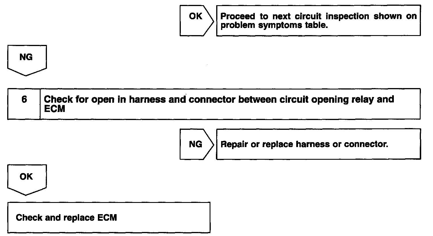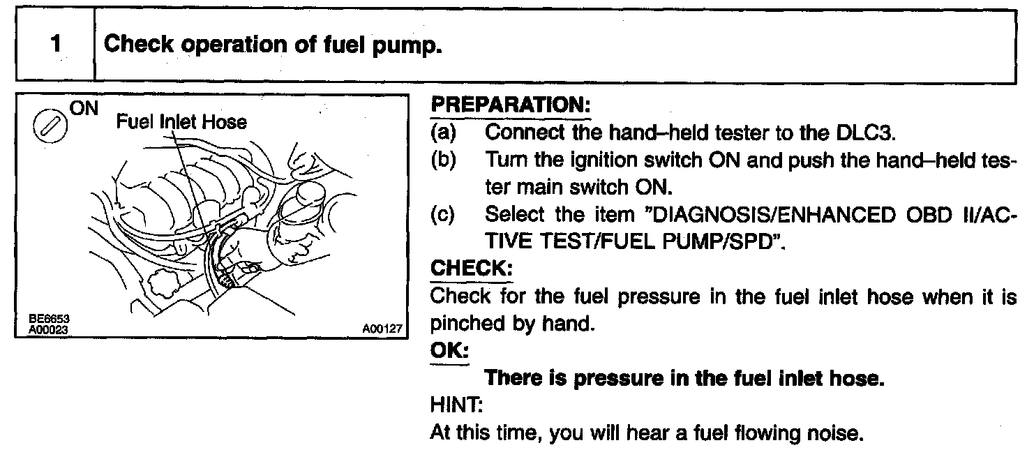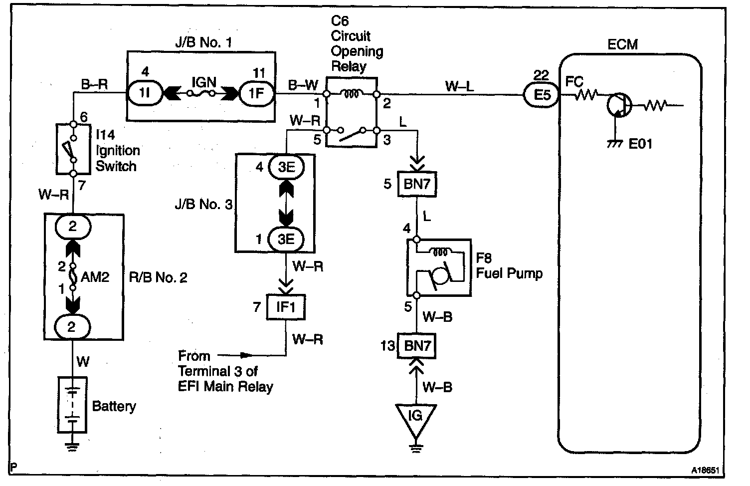 When the STA signal and NE signal are input to the ECM, Tr is turned on, current flows to the coil of the circuit opening relay, the relay switches on, power is supplied to the fuel pump and the fuel pump operates. While the NE signal is generated (engine running), the ECM keeps Tr on (circuit opening relay on) and the fuel pump also keeps operating.