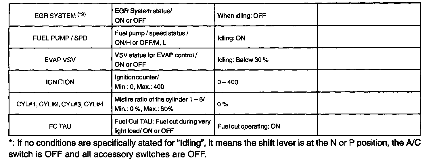 NOTE: The values given below for "Normal Condition" are representative values. So a vehicle may still be normal even if its value differs from those listed here. So, do not depend solely on the "Normal Condition" here when deciding whether a part is faulty or not.