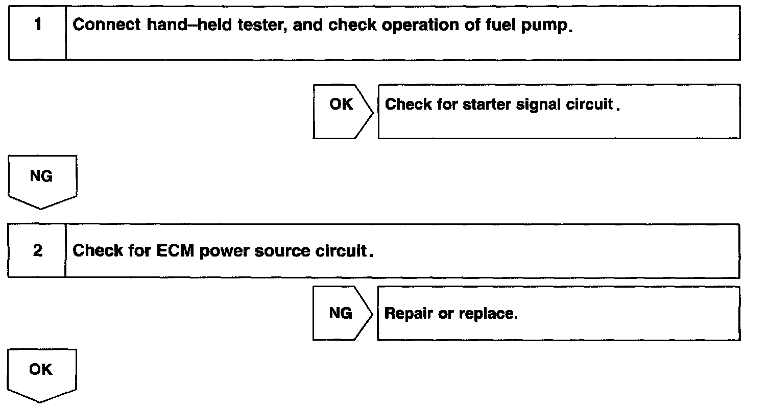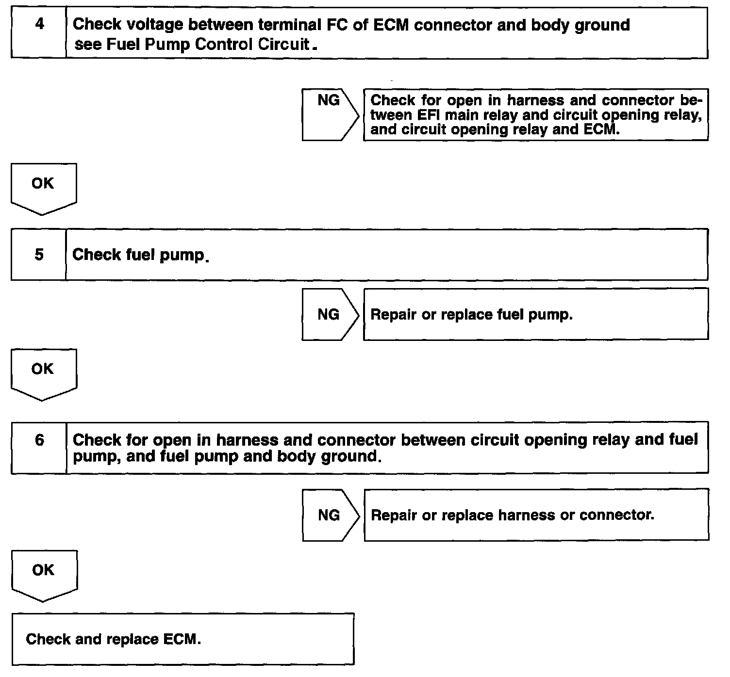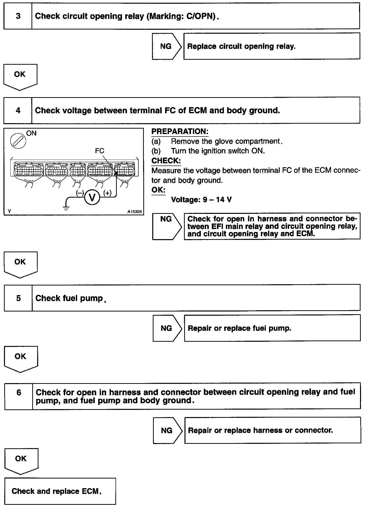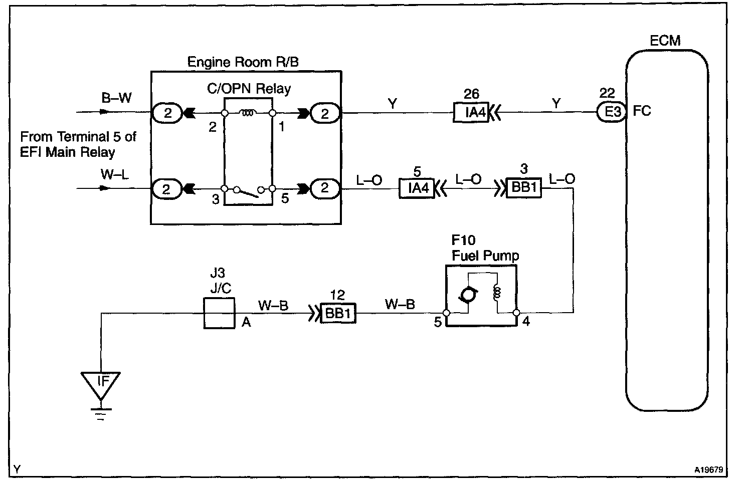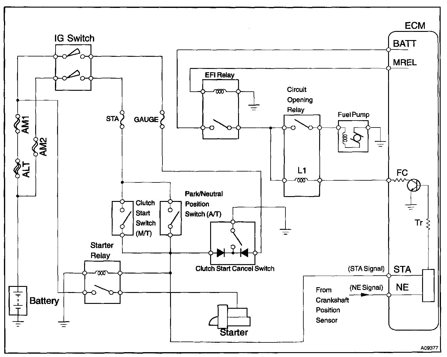 CIRCUIT DESCRIPTIONIn the diagram, when the engine is cranked, current flows from terminal ST of the ignition switch to the starter relay coil, the starter relay switches on and current flows to coil L1 of the circuit opening relay. Thus the circuit opening relay switches on, power is supplied to the fuel pump and the fuel pump operates. When the STA signal and NE signal are input to the ECM, Tr is turned ON, current flows to coil L2 of the circuit opening relay, the relay switches on, and the fuel pump operates. While the NE signal is generated (engine running), the ECM keeps Tr ON (circuit opening relay ON) and the fuel pump also keeps operating.