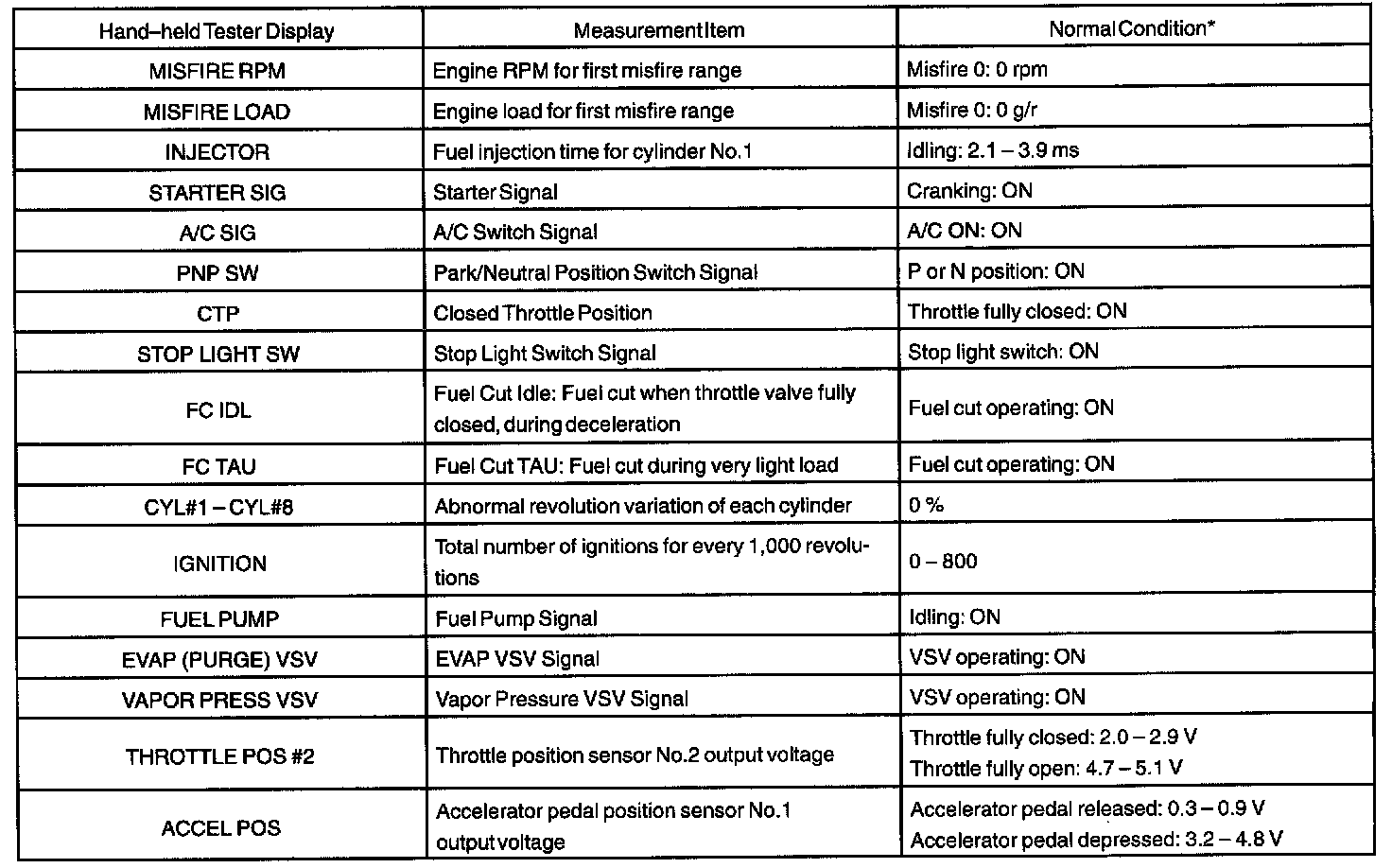 ENGINE OPERATING CONDITIONNOTE: The values given below for "Normal Condition" are representative values. So, a vehicle may still be normal even if its value differs from those listed here. So, do not solely depend on the "Normal Condition" here when deciding whether a part is faulty or not.