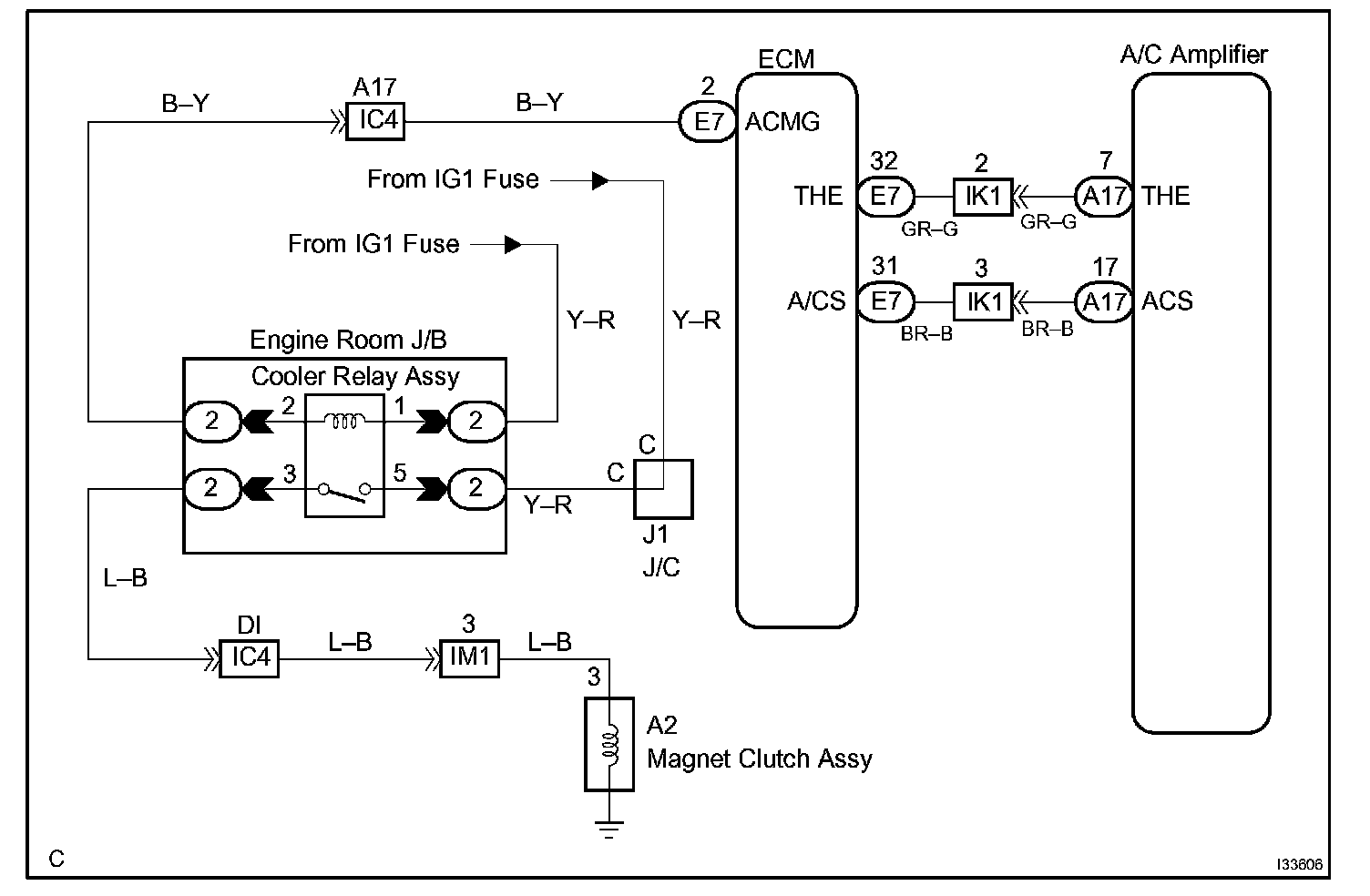 - THE of A/C amplifier: Output the request signal to drive the magnetic clutch, and send it to ECM.