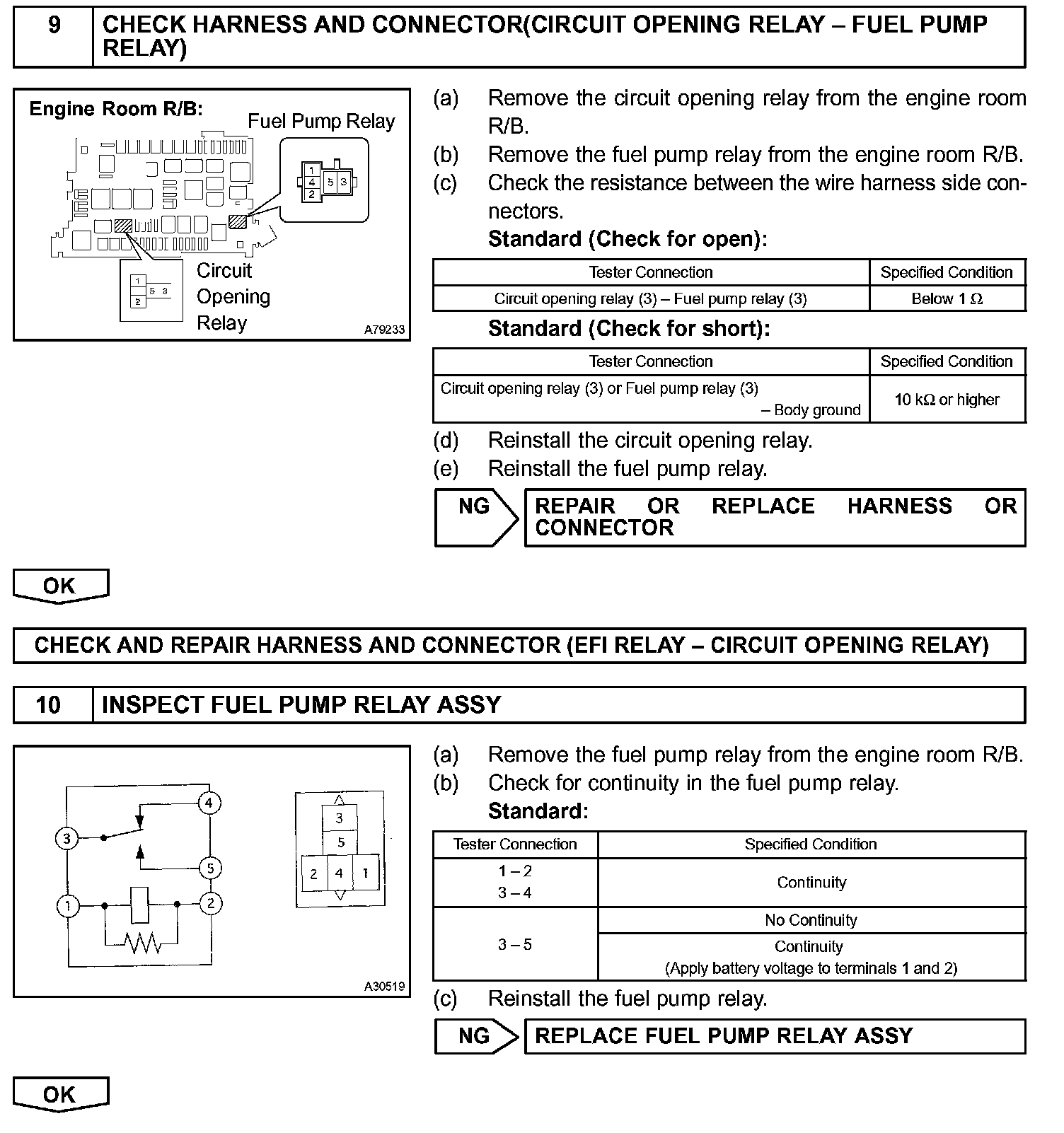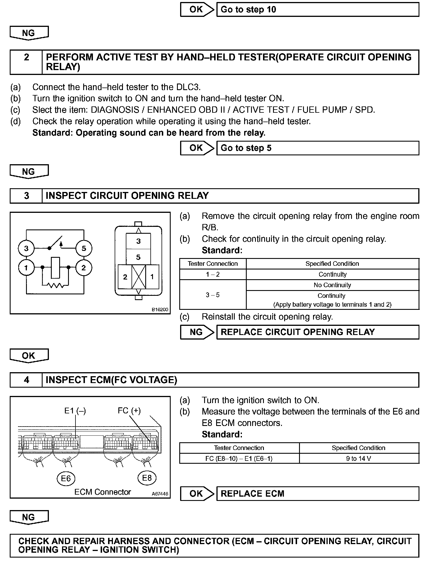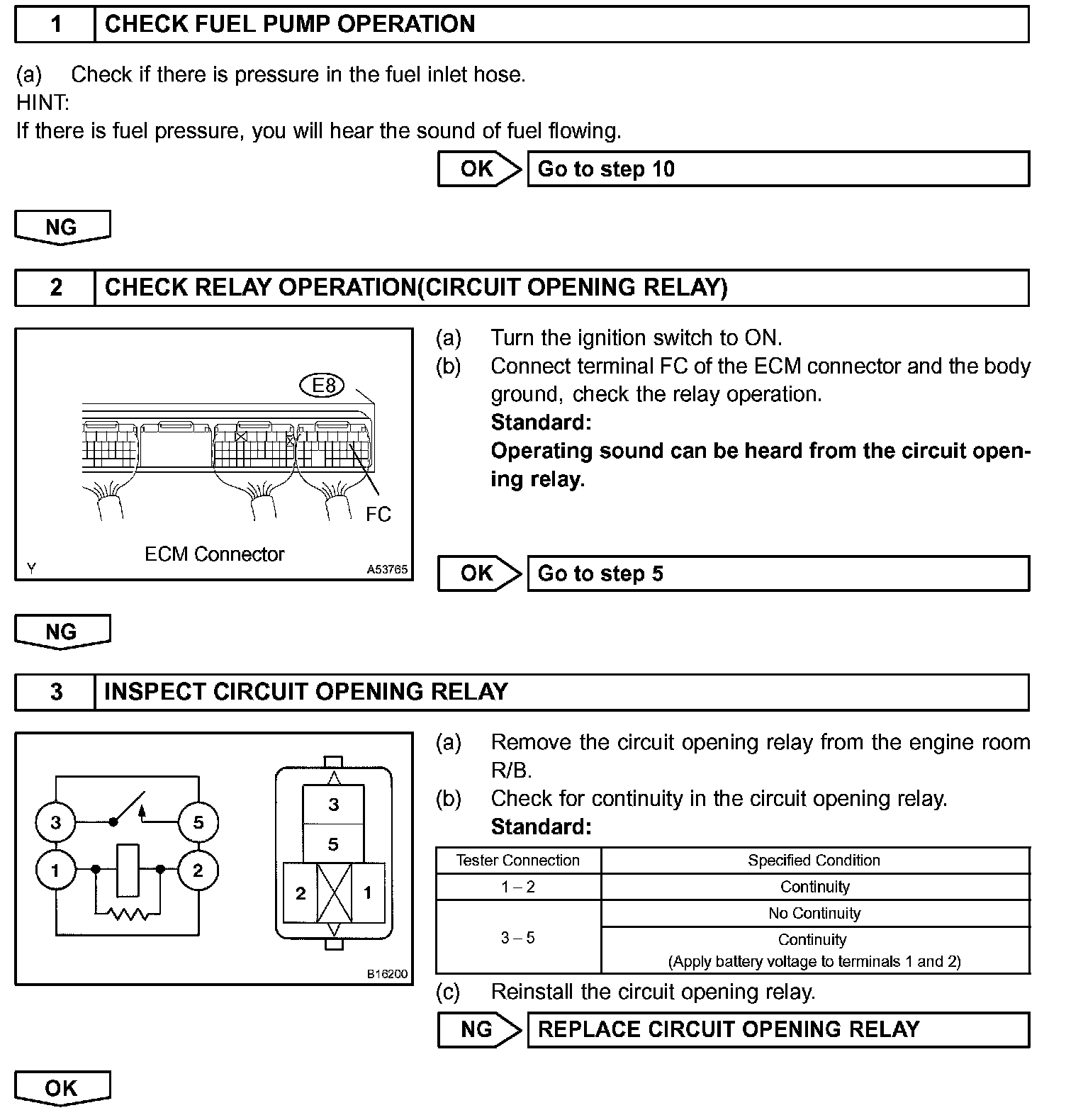 When the STA signal and NE signal are input to the ECM, Tr1 is turned ON, current flows to the coil of the circuit opening relay, the relay switches on, power is supplied to the fuel pump, and the fuel pump operates. While the NE signal is generated (engine running), the ECM keeps the Tr1 ON (circuit opening relay ON) and the fuel pump also keeps operating.