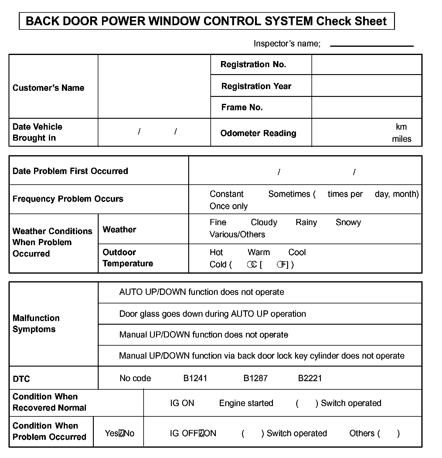 Back Door Power Window Control System Check Sheet: