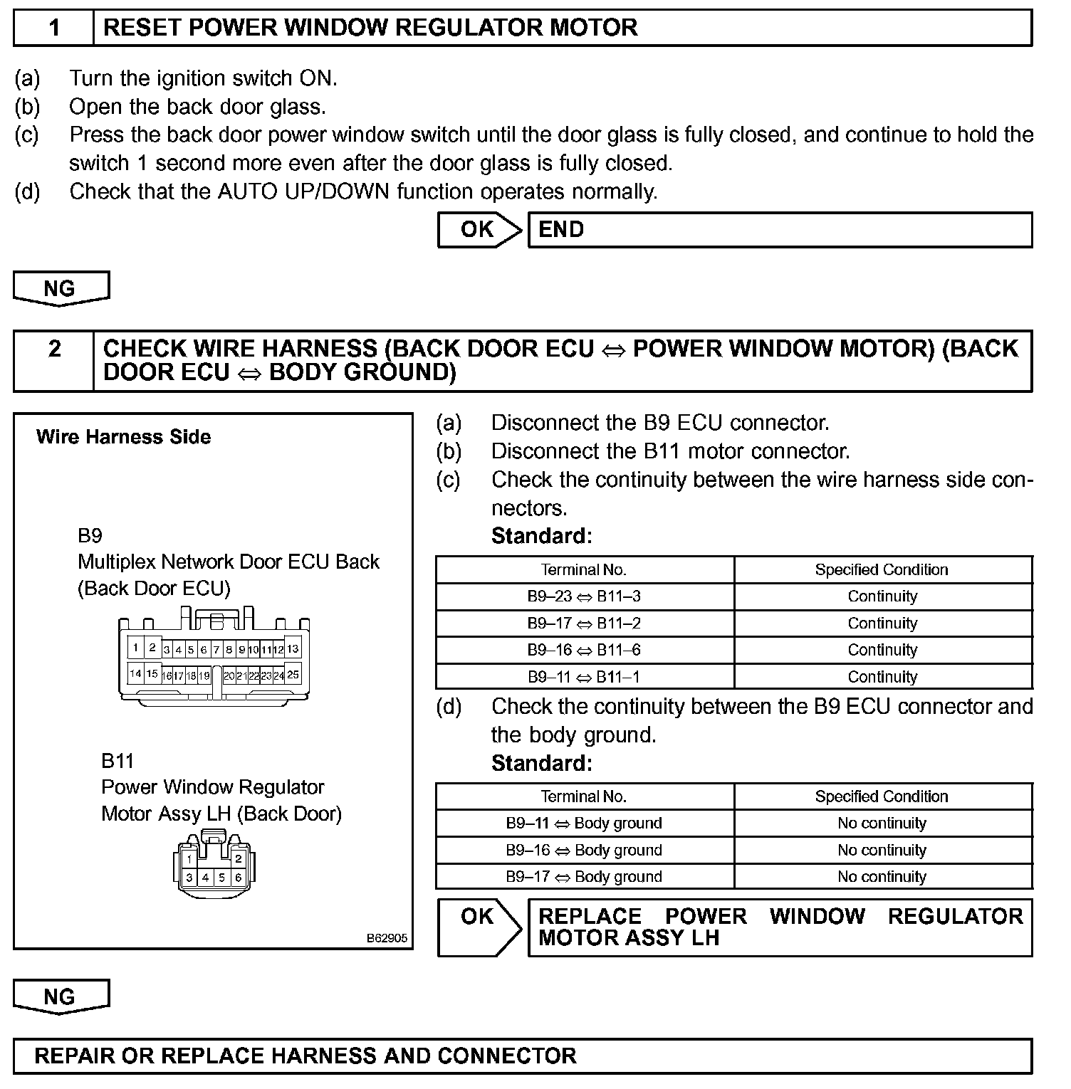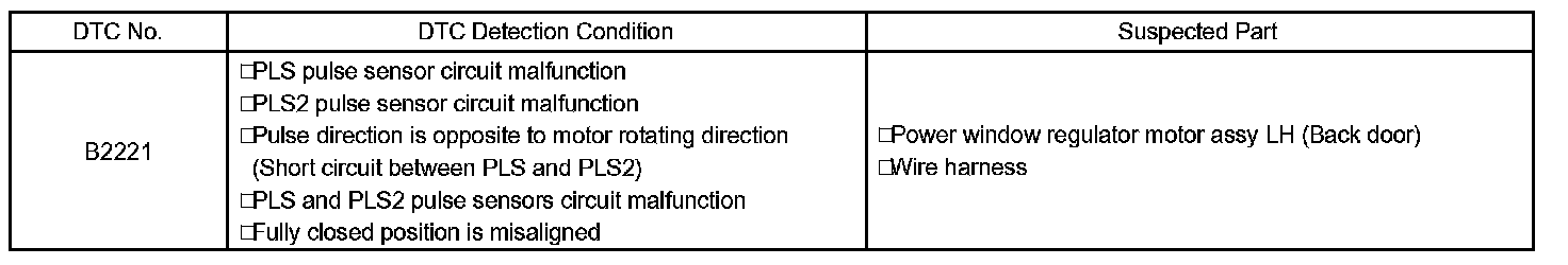 If the pulse sensor in the back door power window motor malfunctions (DTC B2221 is output), the power window functions will be restricted: