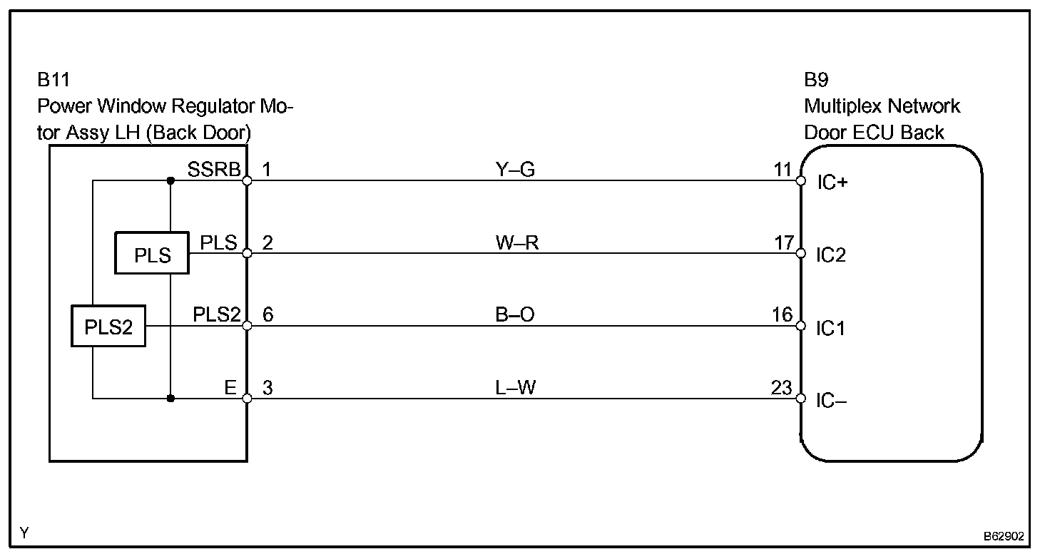 The back door ECU monitors the condition of the power window motor and detects the position of the door glass by using pulse signals output from the 2 pulse sensors in the power window motor.