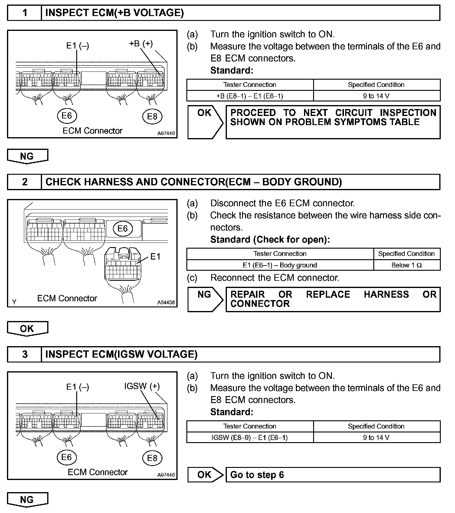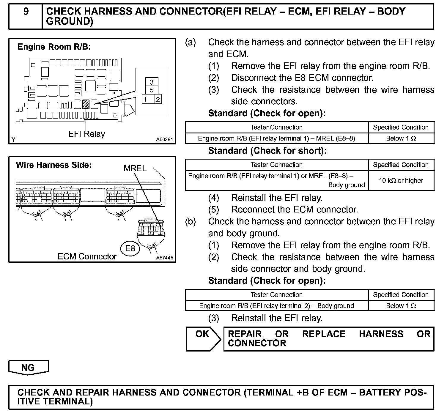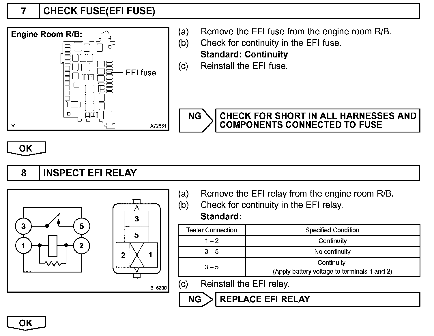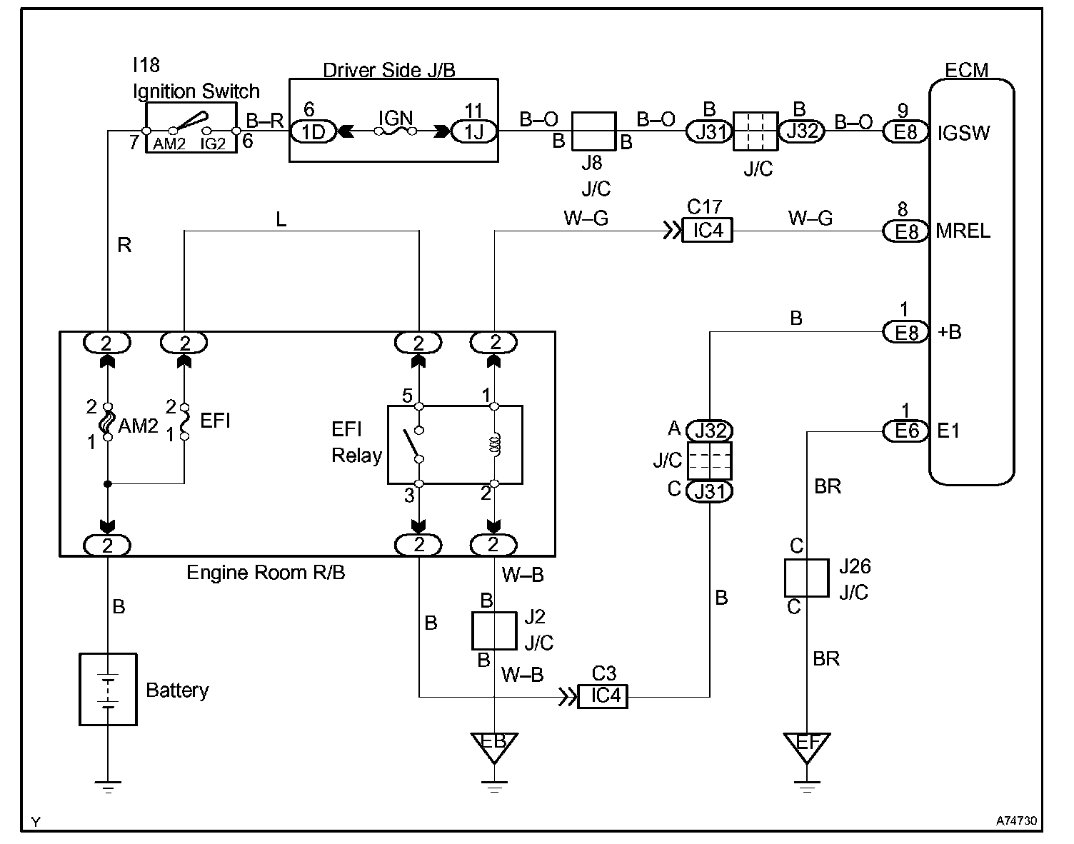 This signal causes current to flow to the coil, closing the contacts of the EFI relay and supplying power to terminal +B of the ECM.
