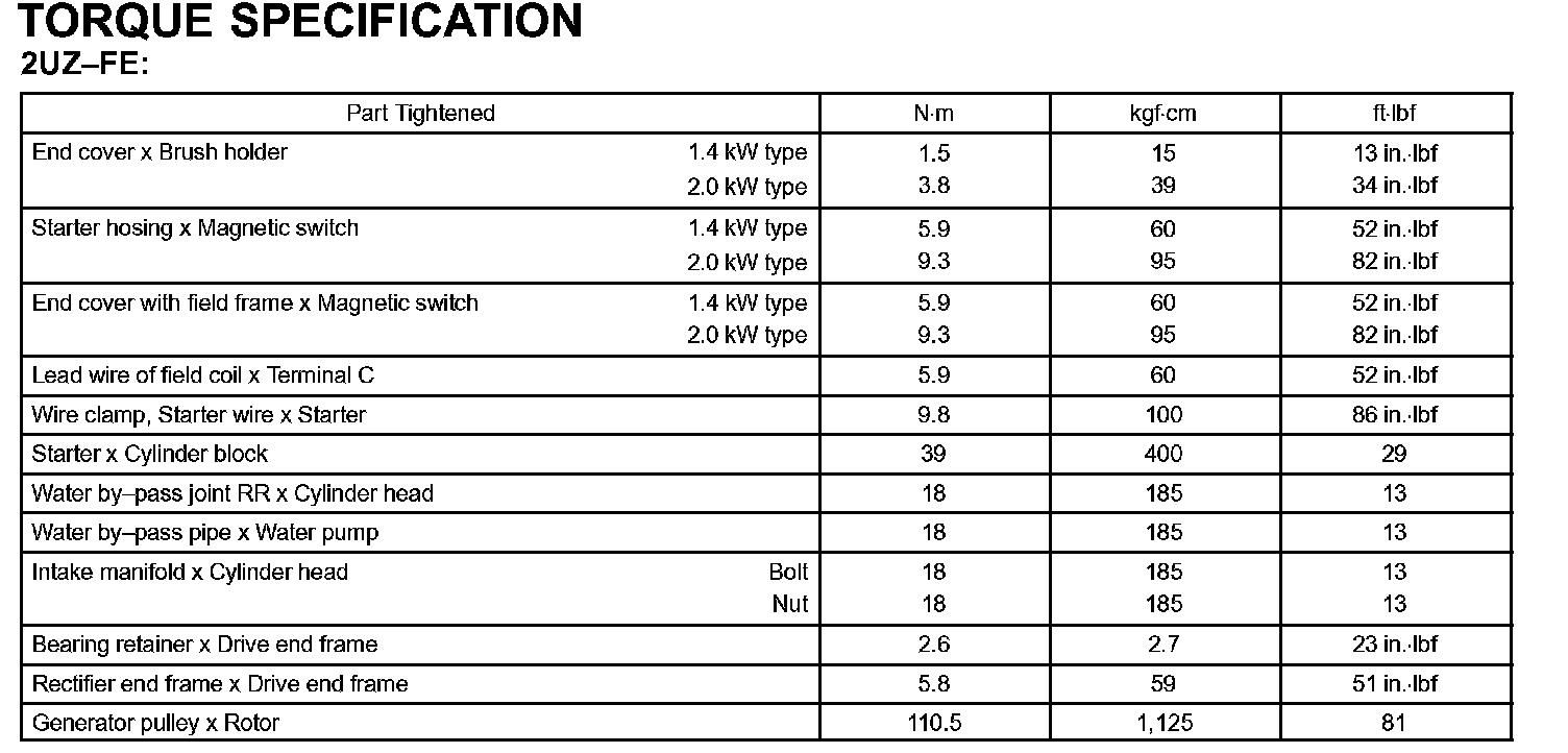 Starting & Charging - Torque Specification Part 1: