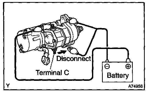 1. With battery connected as above with the clutch pinion gear out, disconnect the negative (-) lead from terminal C. Check that the pinion gear remains out.