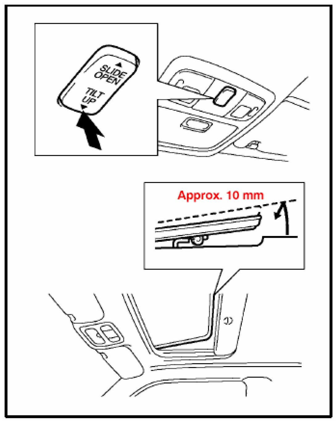 1. Push and hold the "TILT UP" side of the switch until the moon roof tilts all the way up and then tilts down slightly (approximately 10 mm at the rear).