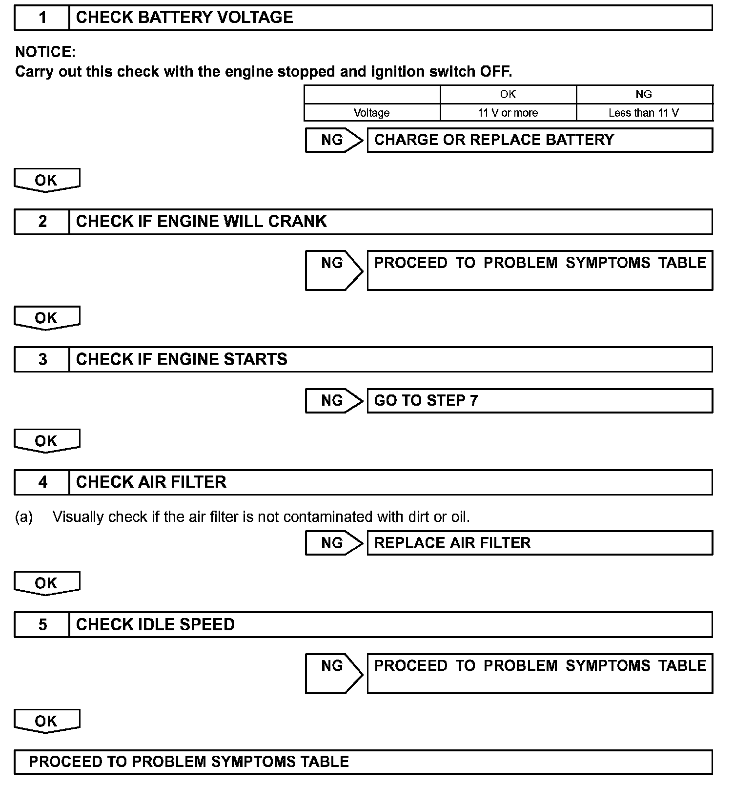 When the malfunction is not confirmed in the DTC check, troubleshooting should be carried out in all the possible circuits considered as causes of the problem. In many cases, by carrying out the basic engine check shown in the flowchart, the location causing the problem can be found quickly and efficiently. Therefore, using this check is essential in the engine troubleshooting.