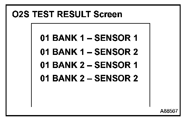 b. On the tester screen, enter the following menus: DIAGNOSIS/CARB OBD II/O2S TEST RESULT. A list of the O2S equipped on the vehicle will be displayed.