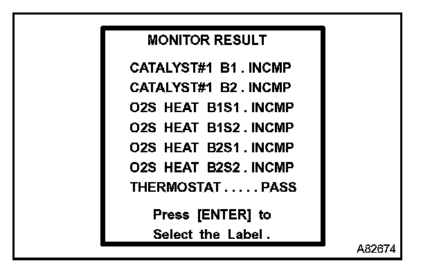 b. Enter the following menus: DIAGNOSIS / ENHANCED OBD II / MONITOR INFO / MONITOR RESULT The Test ID will appear at the beginning of each line, followed by INCMP, PASS, or FAIL.