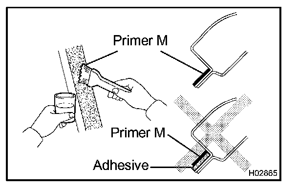 a. Using a brush or sponge, coat the edge of the glass and the contact surface with Primer G as shown in the illustration.