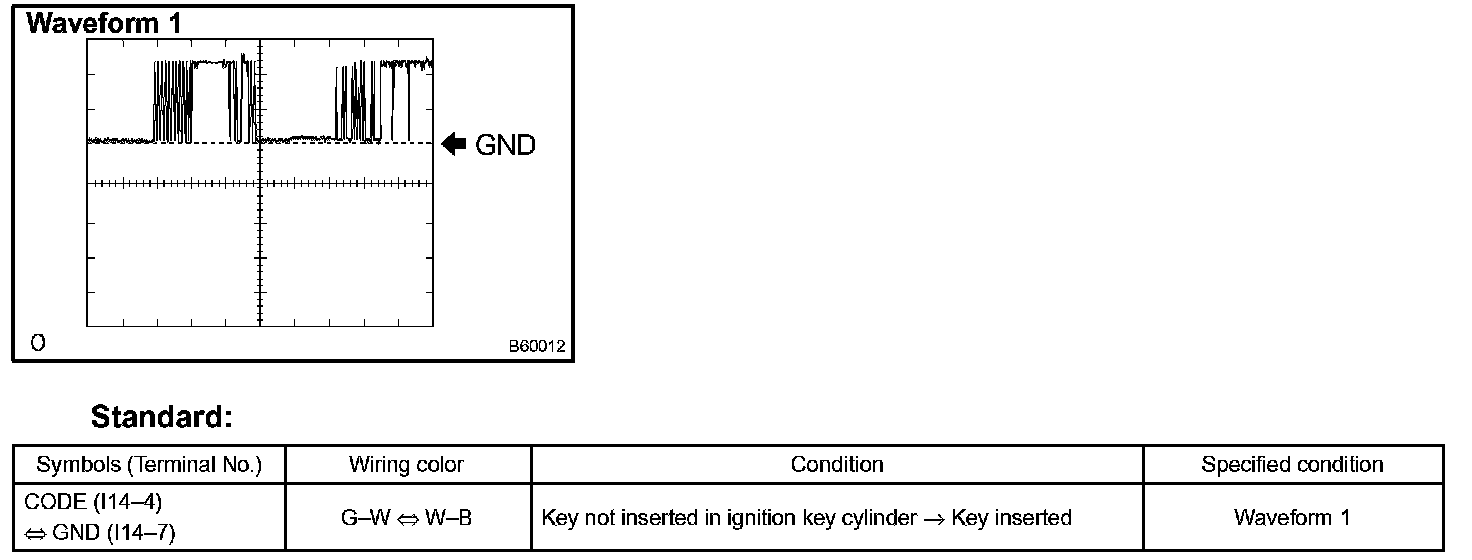 f. Set the oscilloscope at 2 V/DIV and 10 ms/DIV, and insert the key in the ignition key cylinder. Check the waveform 3 between the terminal I14-5 and I14-7 of the transponder key amplifier.