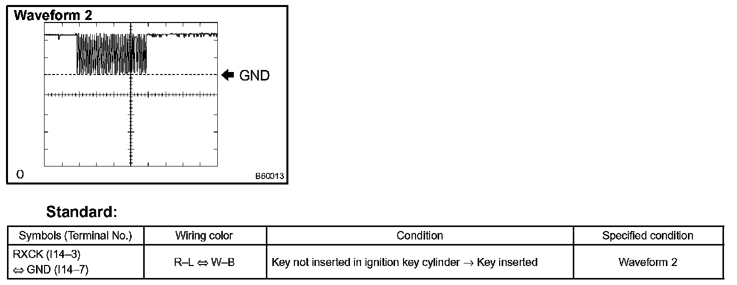 e. Set the oscilloscope at 5 V/DIV and 10 ms/DIV, and insert the key in the ignition key cylinder. Check the waveform 2 between the terminal I14-3 and I14-7 of the transponder key amplifier.