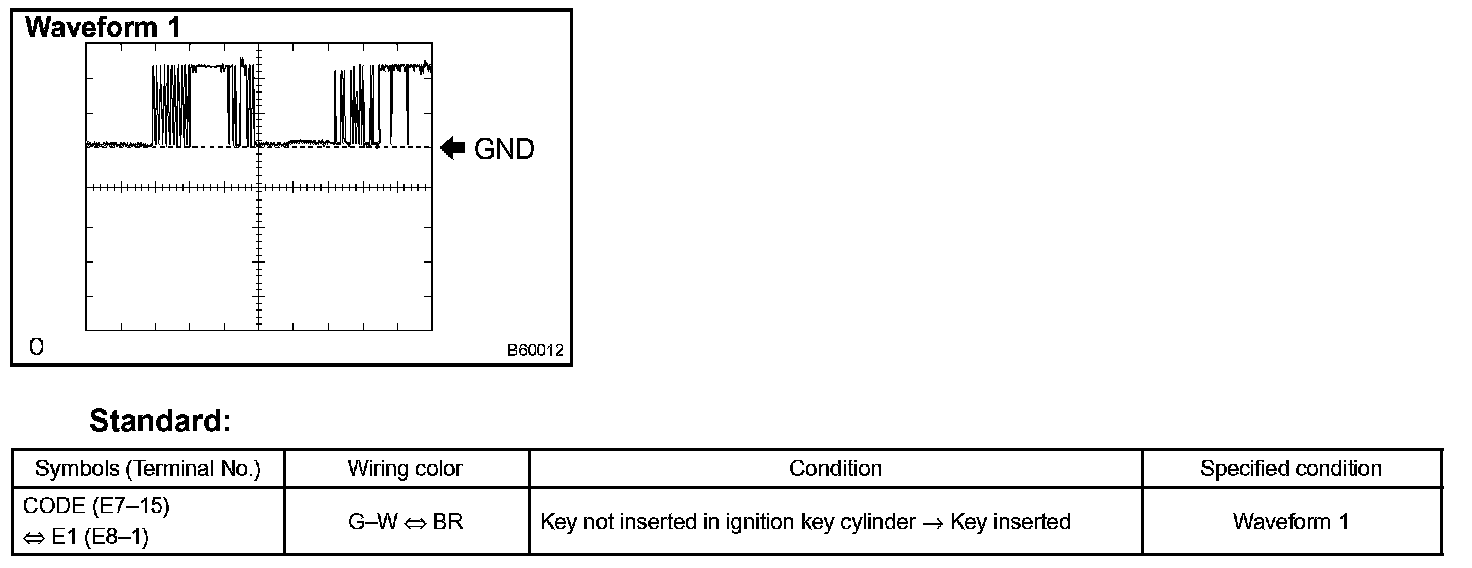 c. Set the oscilloscope at 5 V/DIV and 10 ms/DIV, and insert the key in the ignition key cylinder. Check the waveform 1 between the terminal E7-15 and E8-1 of the ECM.