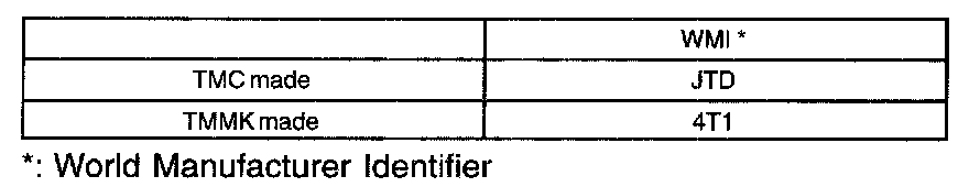 World manufacture identifier is used to distinguish between TMC and TMMK made vehicles. The first 3 digits and letters of the vehicle identification number shows the world manufacturer identifier.