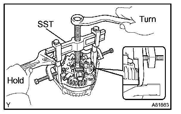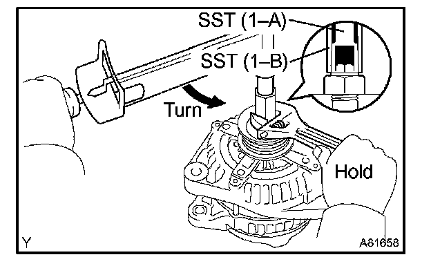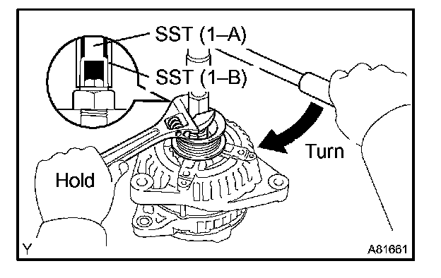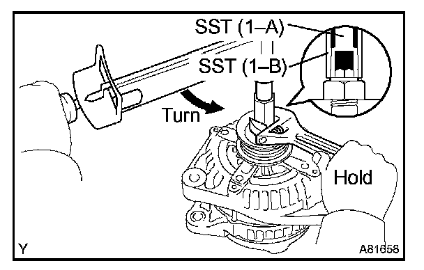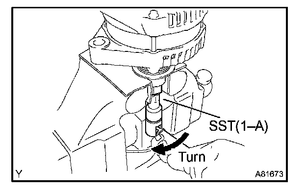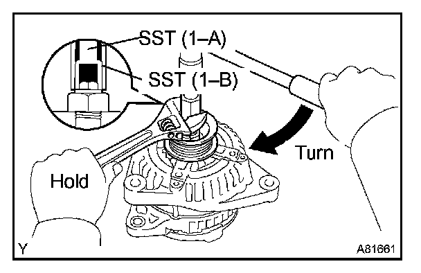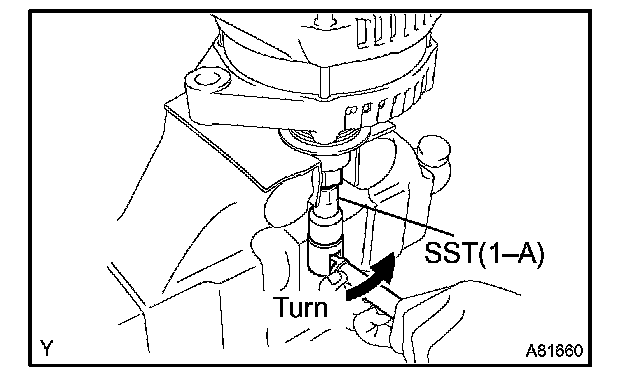 d. To loosen the pulley nut, turn SST (1-A) in the direction shown in the illustration.