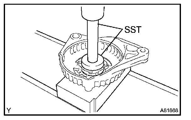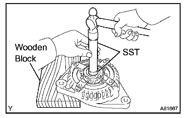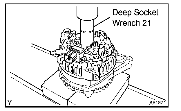 a. Using a deep socket wrench 21 and a press, press in the generator rectifier end frame carefully.