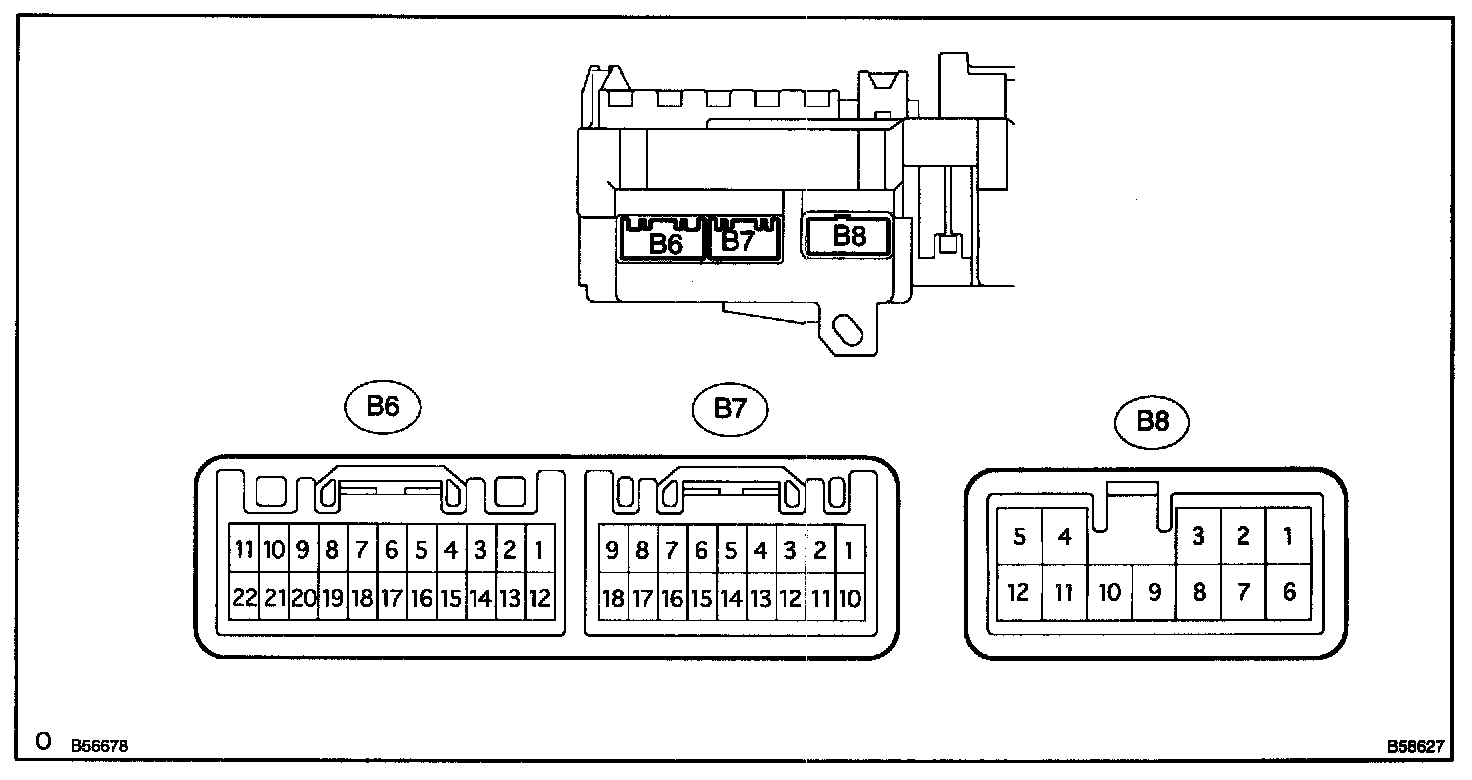 b. Reconnect the B6 body ECU connector, and check the voltage of each terminal of the connectors.