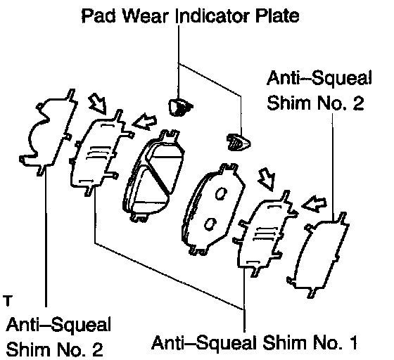 b. Install the anti-squeal shim No. 1 and No. 2 on each pad.