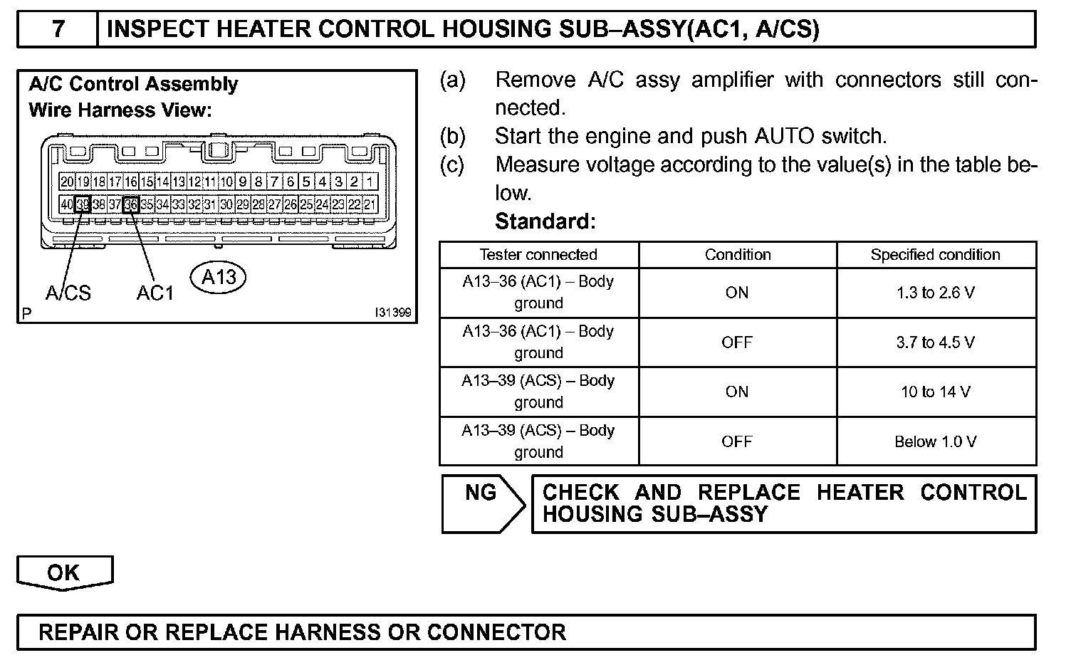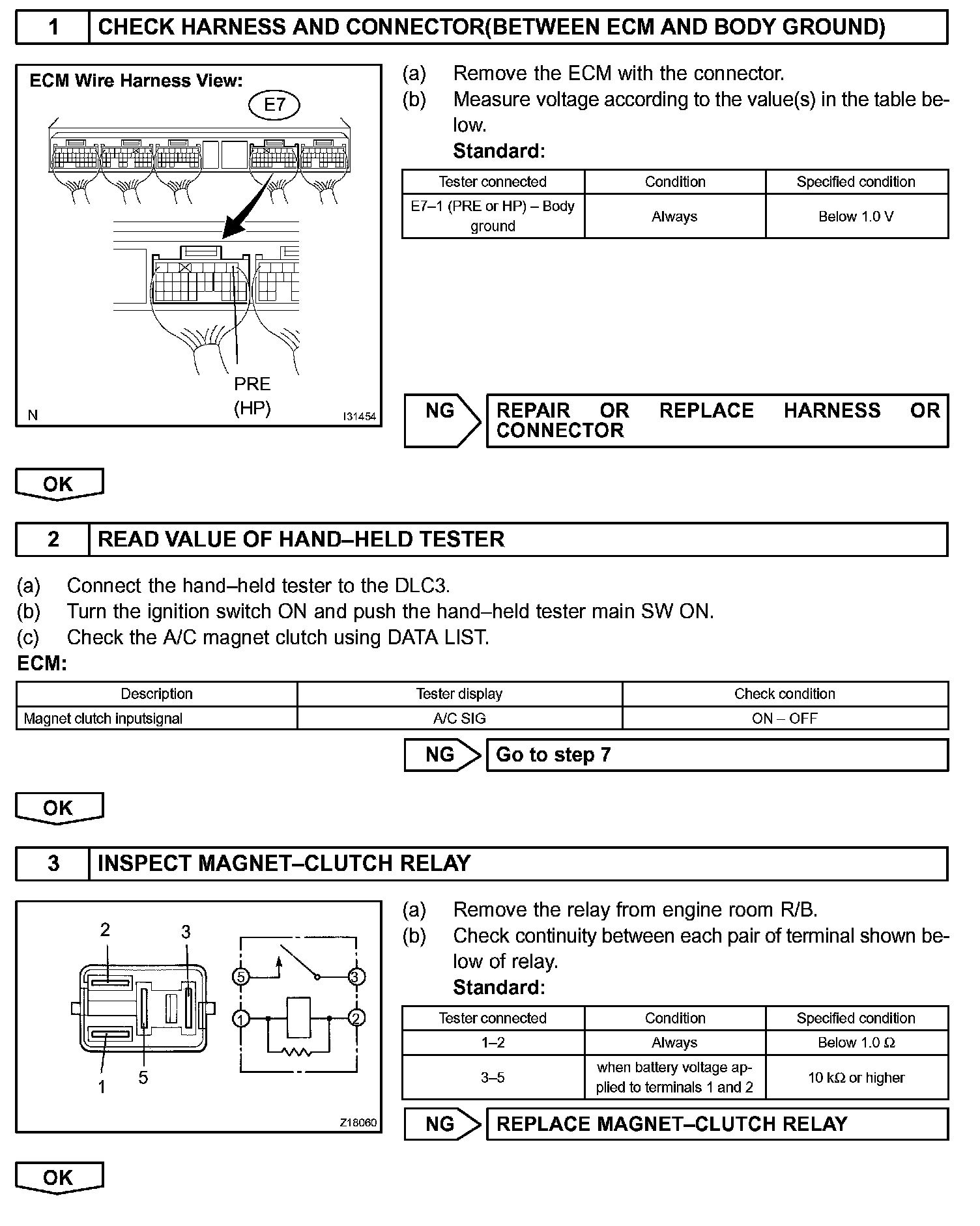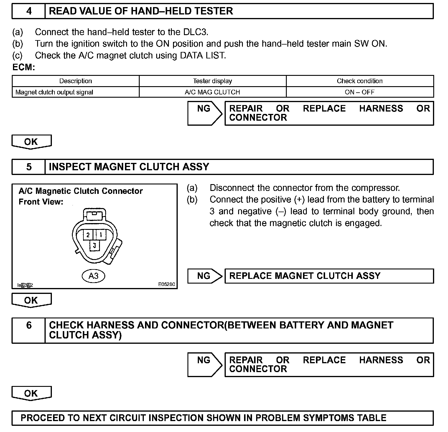 The A/C amplifier outputs the magnetic clutch ON signal from terminal AC1 to the ECM receives this signal, it sends a signal from terminal ACMG and switches the magnetic clutch relay ON, thus turning on the magnetic clutch.