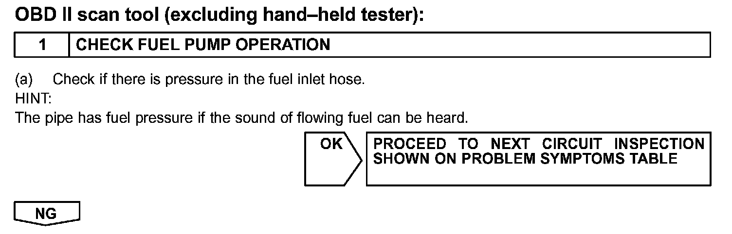 When the STA signal and NE signal are input to the ECM, Tr is turned ON, current flows to coil of the circuit opening relay (Marked: C/OPN), the relay switches on, power is supplied to the fuel pump and the fuel pump operates.