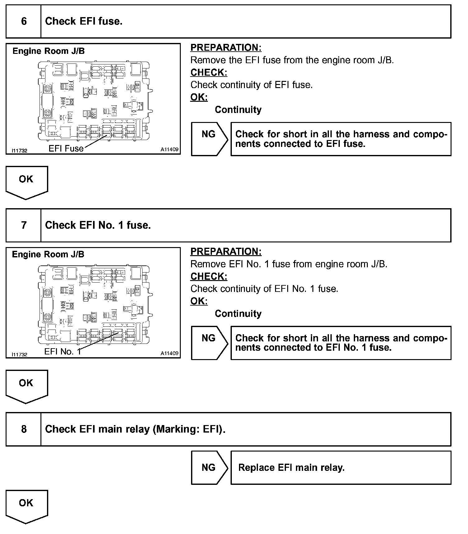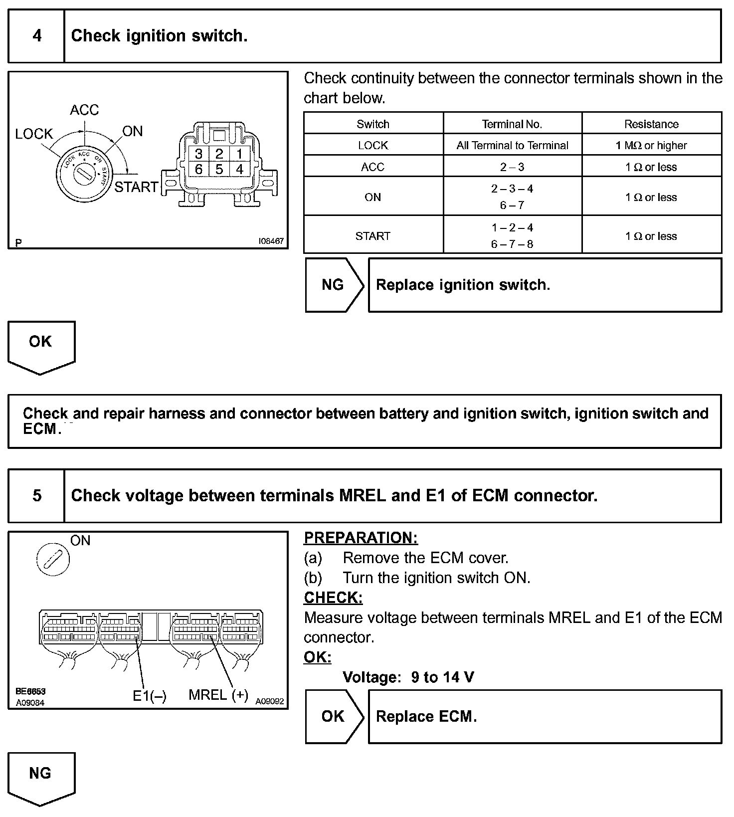 CIRCUIT DESCRIPTIONWhen the ignition switch is turned ON, battery voltage is applied to terminal IGSW of the ECM. The ECM "MREL" output signal causes current to flow to the coil, closing the contacts of the EFI relay and supplying power to terminal +B of the ECM.