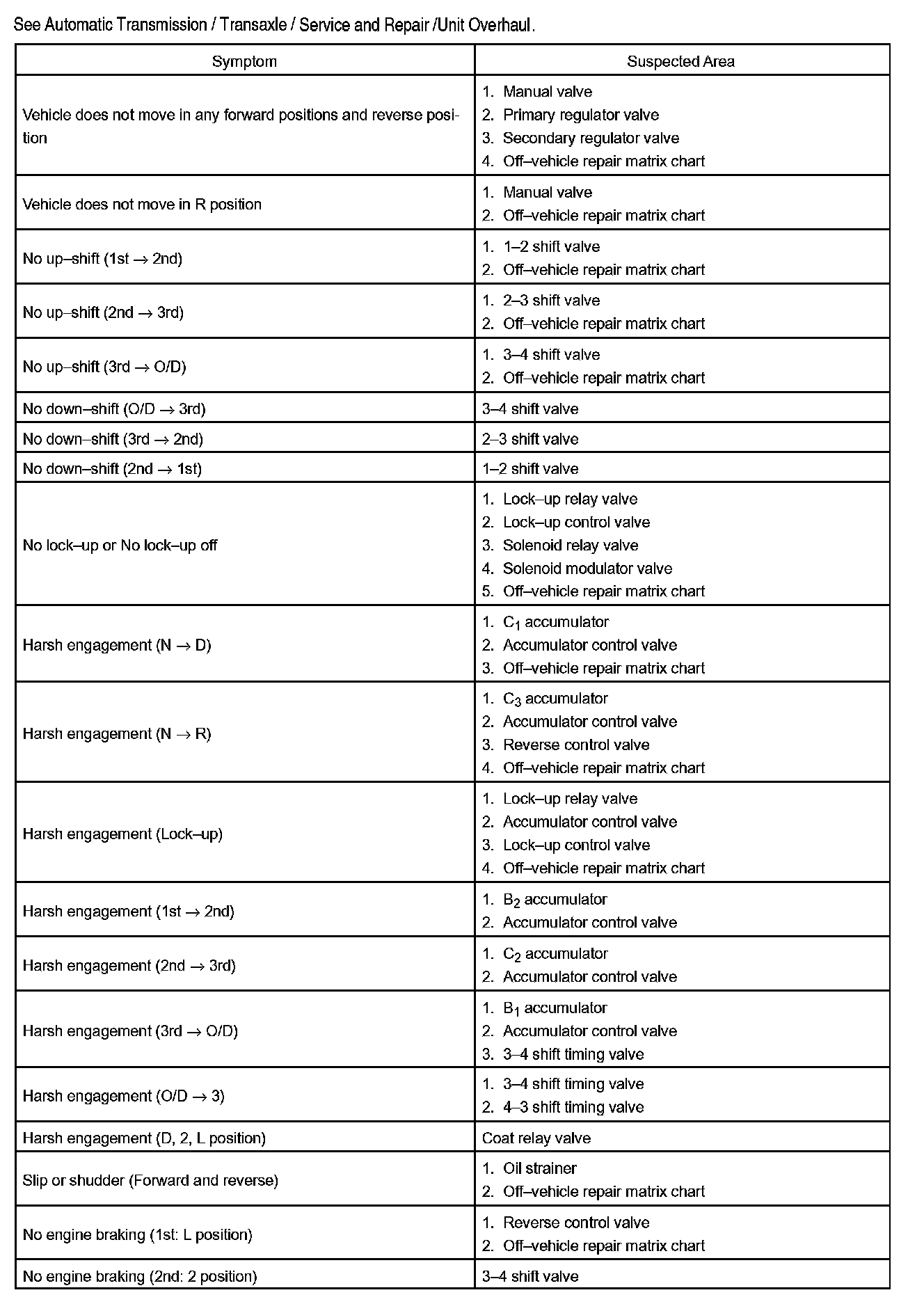 Chart 2: On-vehicle repair matrix chart