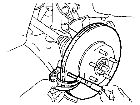 c. If the disc runout is the maximum value or greater, check the bearing play in the axial direction and check the axle hub runout. If the bearing play and axle hub runout are normal, adjust the disc runout or grind it on a "On-car" brake lathe.