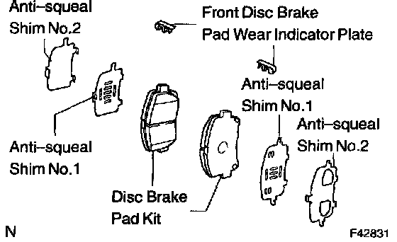 b. Remove the anti-squeal shim No.1 and anti-squeal shim No.2 from each pad.
