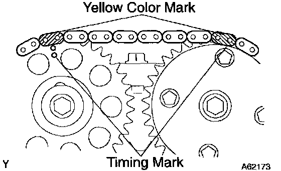 b. Install the timing chain on the crankshaft timing sprocket with the yellow color link aligned with the timing mark on the crankshaft timing sprocket.