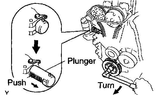 HINT: If the plunger does not spring out, press the slipper into the chain tensioner with a screwdriver so that the hook is released from the knock pin and the plunger springs out.